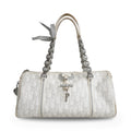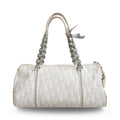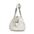 Christian Dior 'Romantique' boston bag in white and grey oblique monogram printed coated canvas with white and grey leather trim, dual chain shoulder straps with leather interweaving, and a top zip opening in silver hardware revealing a grey satin inner lining with a zip pocket.