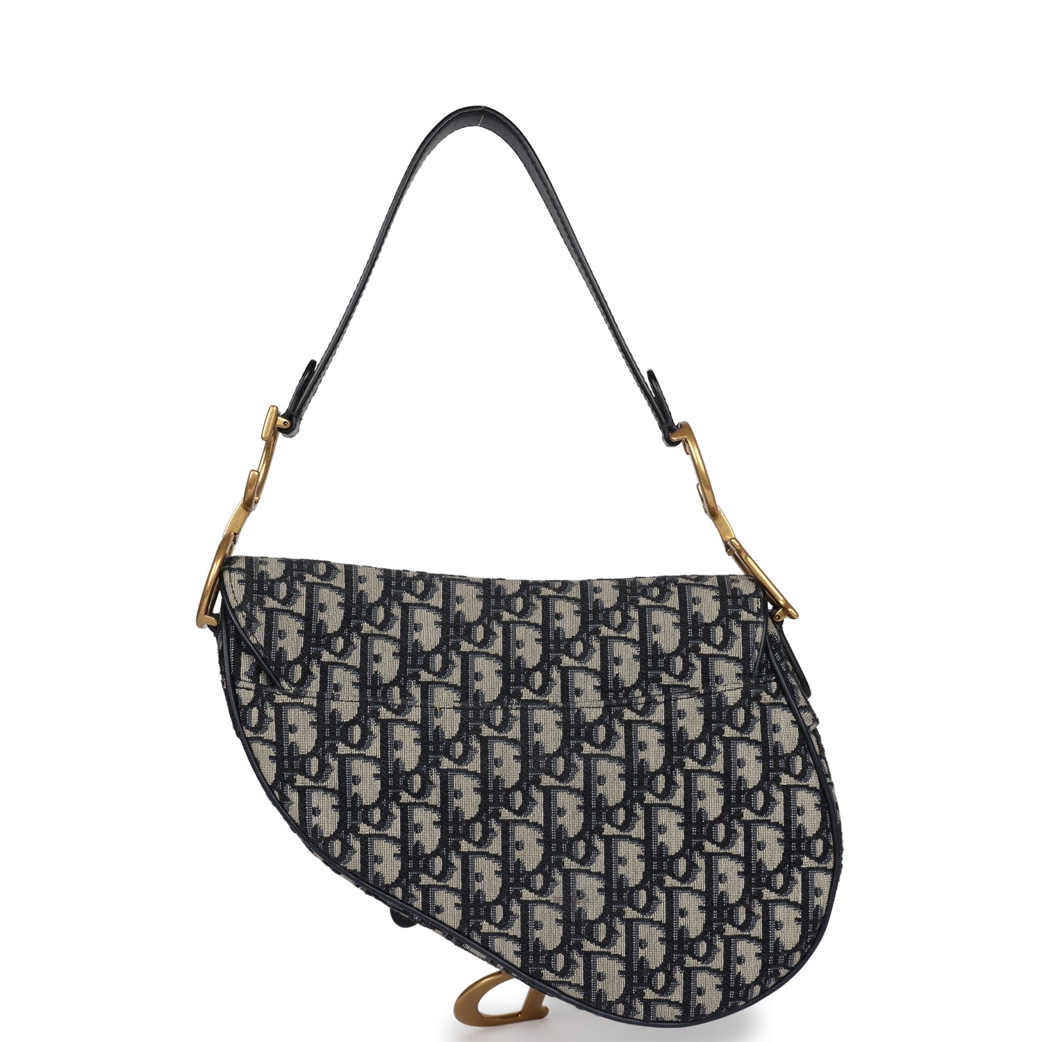 This Christian Dior Saddle Bag is navy blue monogram Oblique Jacquard canvas with antique gold hardware, featuring tonal stitching, leather trimming, a saddle flap with a D stirrup clasp on a magnetic strap, back exterior pocket, antique gold-finish metal signature "CD" on both side of the shoulder strap, and comes with an extra removable leather/canvas shoulder/crossbody strap.