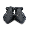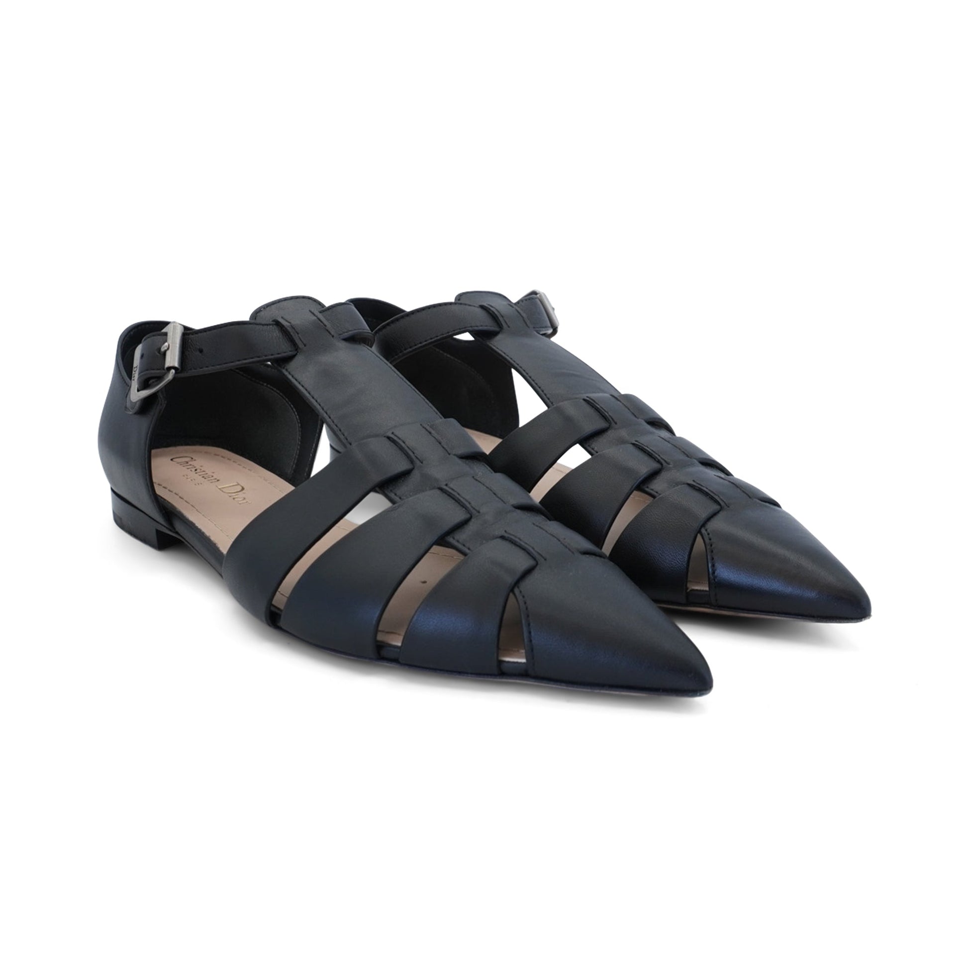 Christian Dior 'Sauvage' pointed toe cage flats in black leather with adjustable strap and silver buckle hardware.