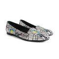Christian Dior flats in metallic silver with black, yellow, pink and teal floral brocade pattern.