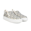 Christian Dior slip-on low-top sneakers in cream and grey with white chunky rubber soles. Features embroidered monogram oblique pattern with white mesh interior lining, engraved logo on the heel, and white heel pull-tab.