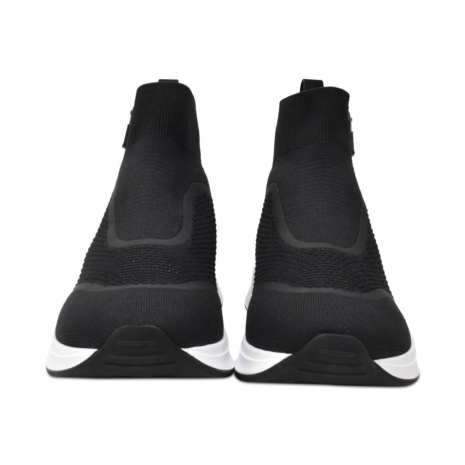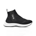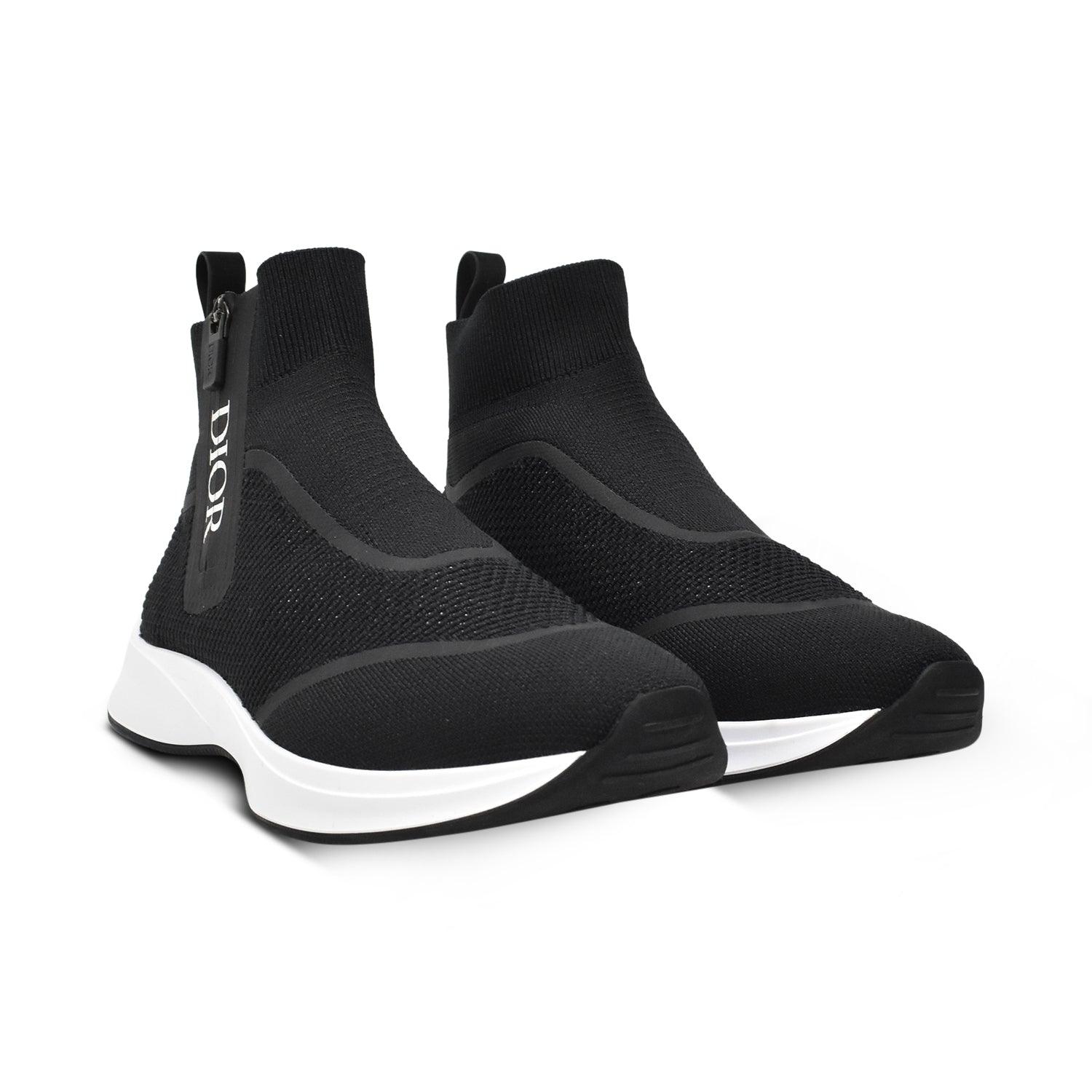 Christian Dior sock sneakers in black knit with white rubber soles. Features exposed side zipper with logo.
