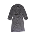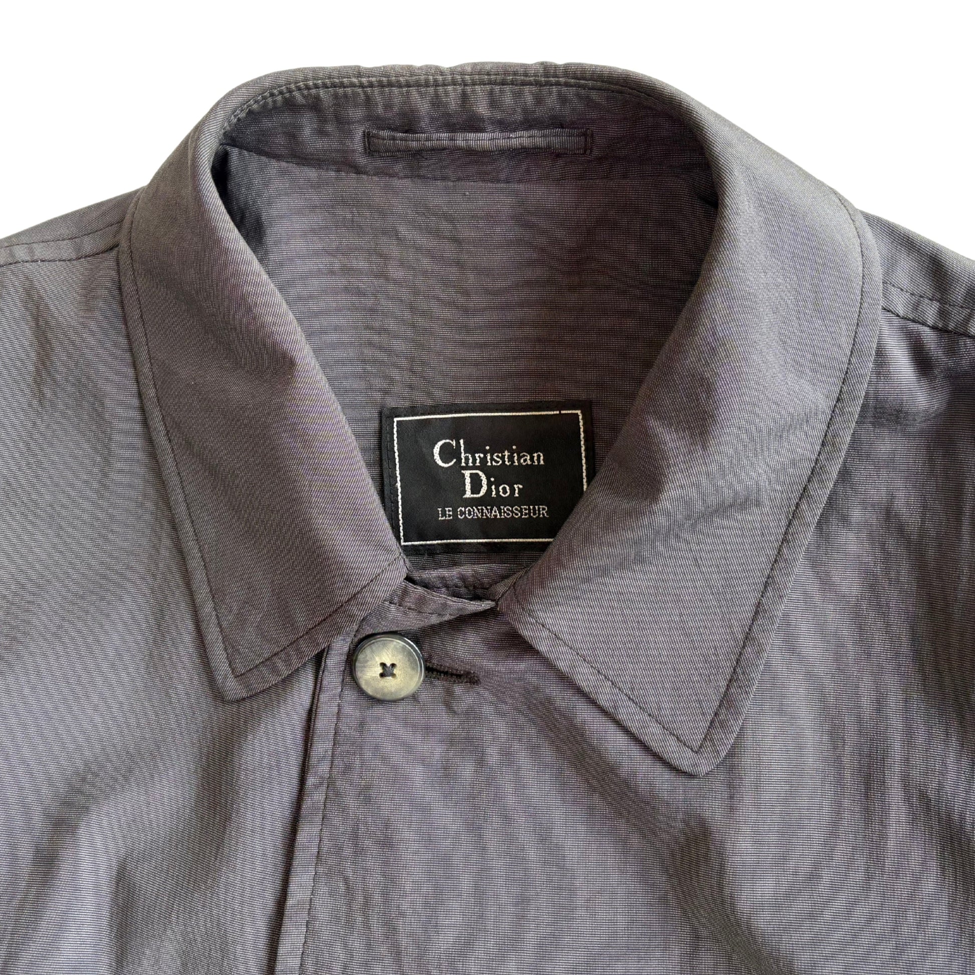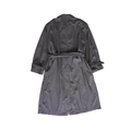 Christian Dior vintage trench coat in grey nylon blend with large tortoise buttons, side pockets, buckles at the cuffs, a waist belt, and a point collar.