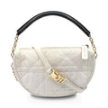 Christian Dior 'Vibe Small Hobo' shoulder bag in white cannage quilted leather. Features a navy blue leather top handle, a white leather with gold hardware chain and buckle shoulder strap, black logo along the bottom, and a top zip closure with a white rubber zipper pull. The interior is white suede lined with a card slot.