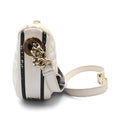 - Condition = As is. Discolouration to white leather throughout. Scuffing to leather throughout. Cracking and chipping to black painted leather detailing along the bottom. Discolouration to long strap as shown. Discolouration to interior suede lining.