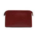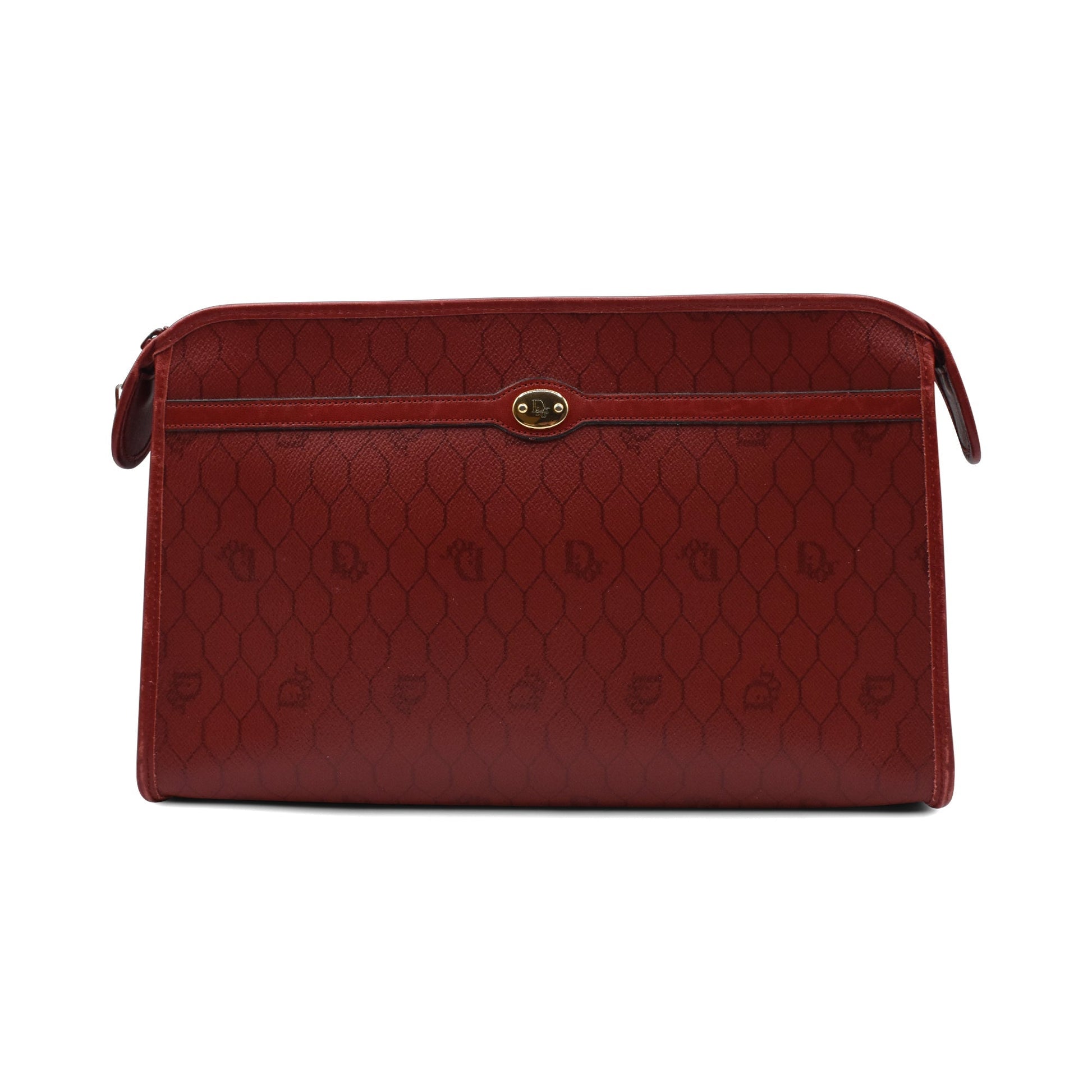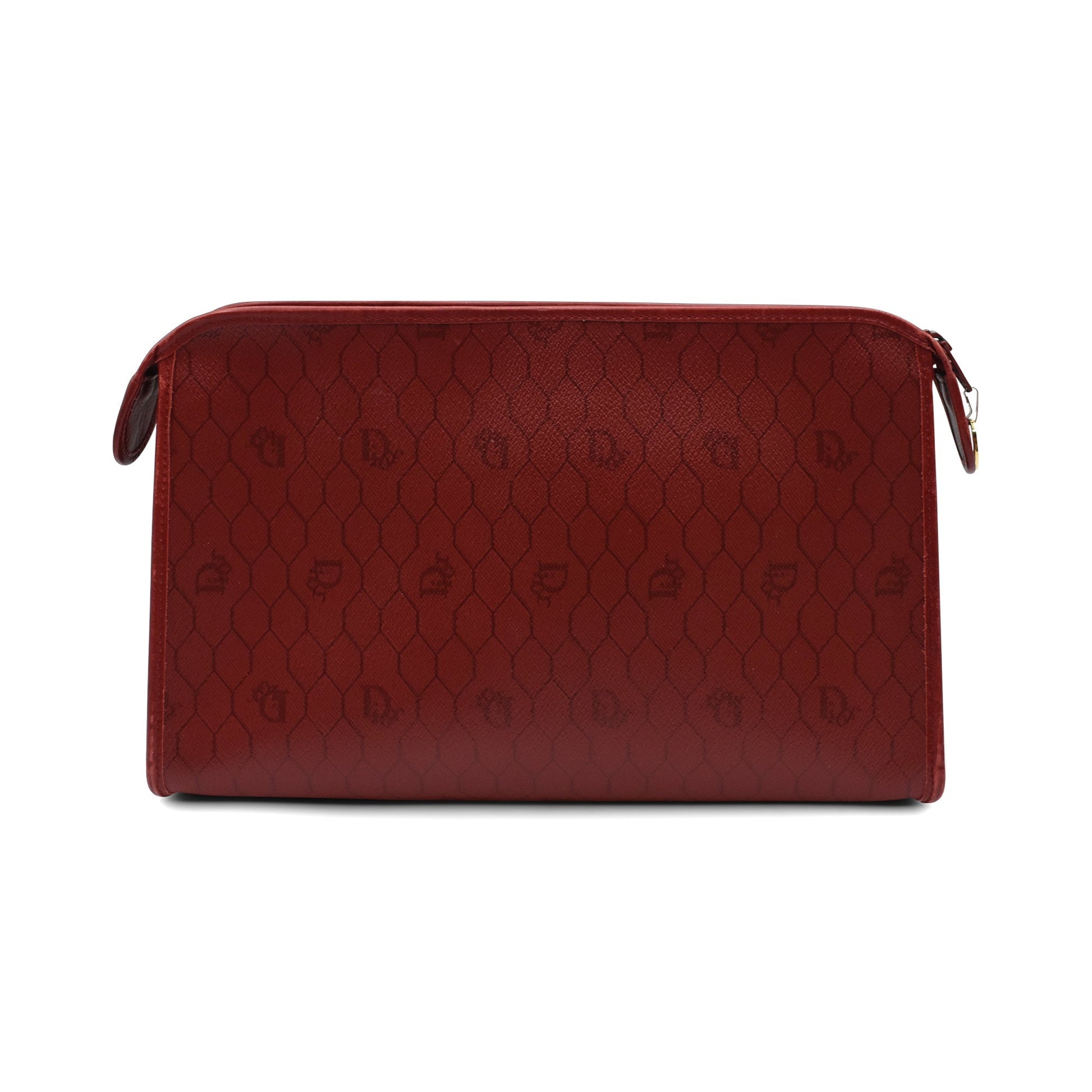 Christian Dior rectangular vintage pouch in red coated canvas with dark red honeycomb logo monogram pattern throughout. Features a top zip closure with a gold logo pendant zipper pull, gold hardware logo on the front, and red leather trim.