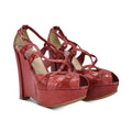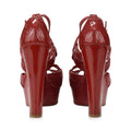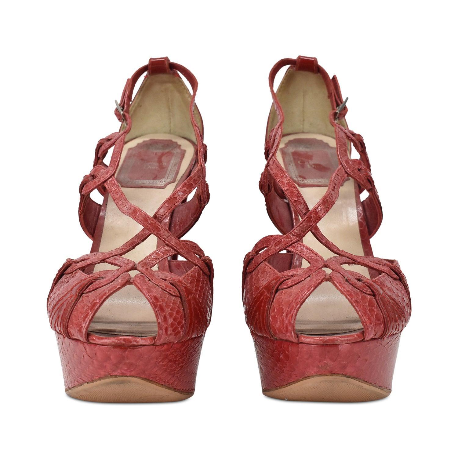 Christian Dior wedge heels in red snakeskin patent leather with swirl leather strap, block wedge heel, and buckle closure in silver hardware.