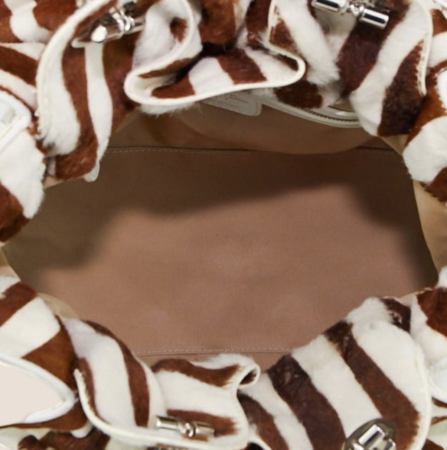 This drawstring Le Trente tote features hand-stitched of leather and zebra print pony hair, an adorable charm hanging off the front and two leather handles combined with triple silver-plated chains.