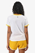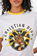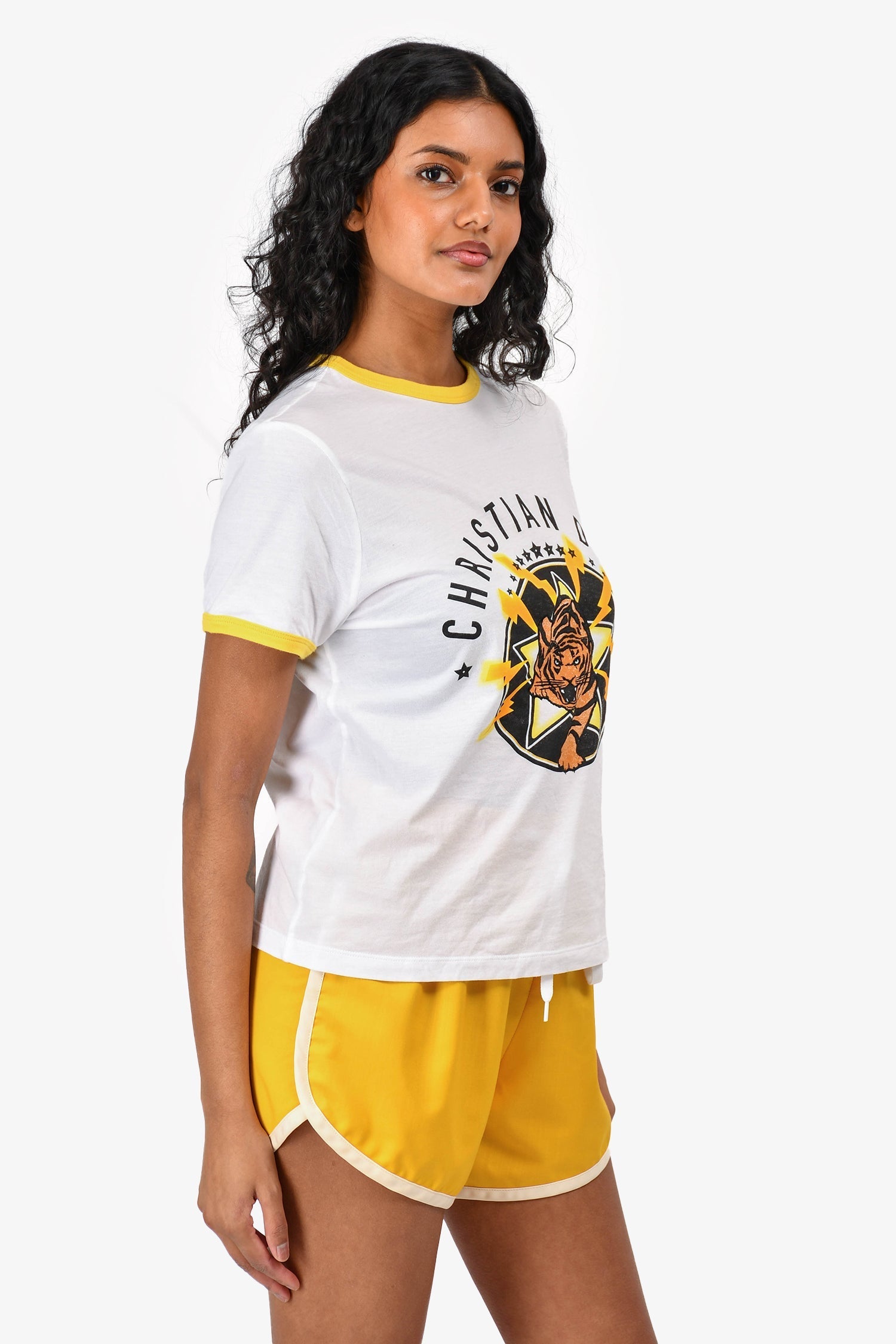 Christian Dior White/Yellow Tiger Printed Short Sleeve T-Shirt. Round neckline. Ribbed yellow neckline and cuffs. Tonal stitching.