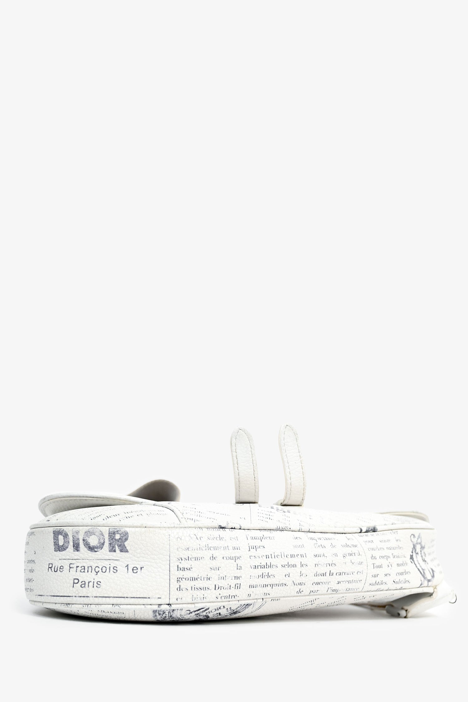 Christian Dior x Daniel Arsham 2020 White/Grey Newspaper Printed Saddle Bag. Fold-over flap with a magnetic closure. Zipped interior with a satin motif lining. Canvas crossbody strap with a buckle closure. Tonal stitching.
