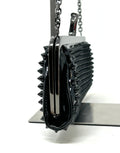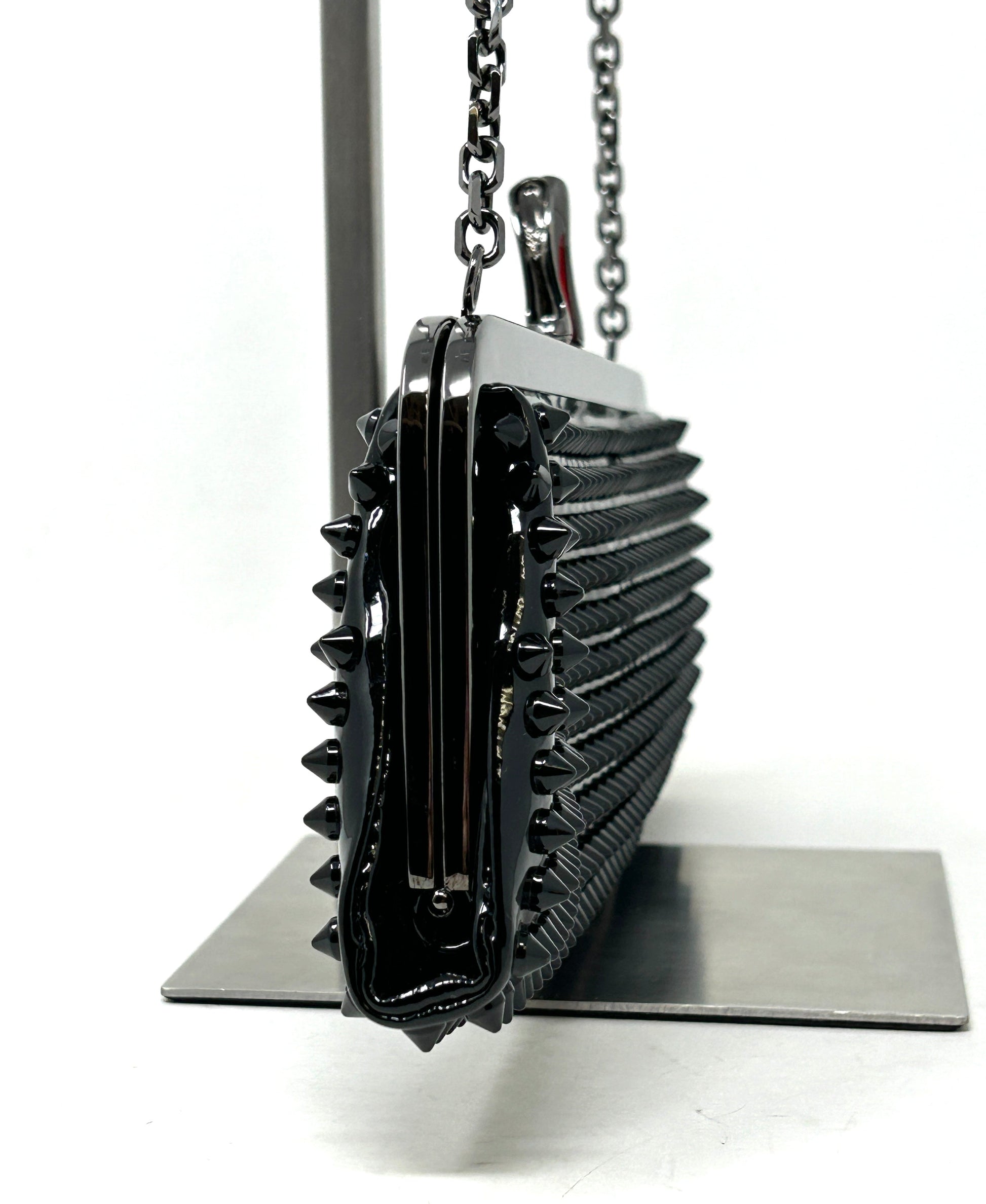 - Black patent leather clutch bag featuring spikes all over, a clasp shaped as Prestige Totess, gunmetal tone metal chain