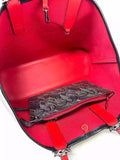 - Black coated canvas monogram tote bag featuring gunmetal hardware, dual shoulder straps, red canvas lining, open top and a detachable pouch