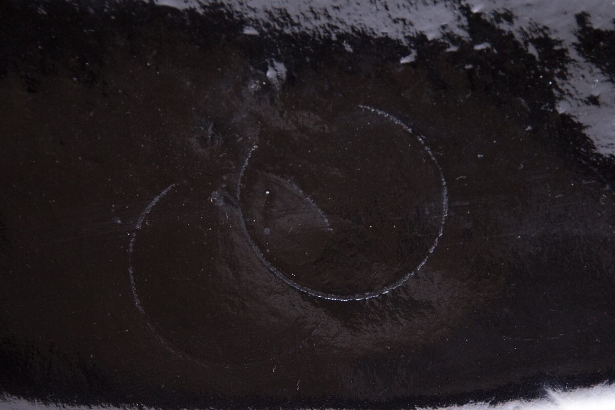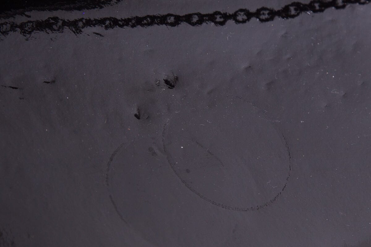 Christian Louboutin Black Patent Logo Medallion Clutch. This item is in fair condition; scratching/wear and creasing on exterior and wear to suede under flap.