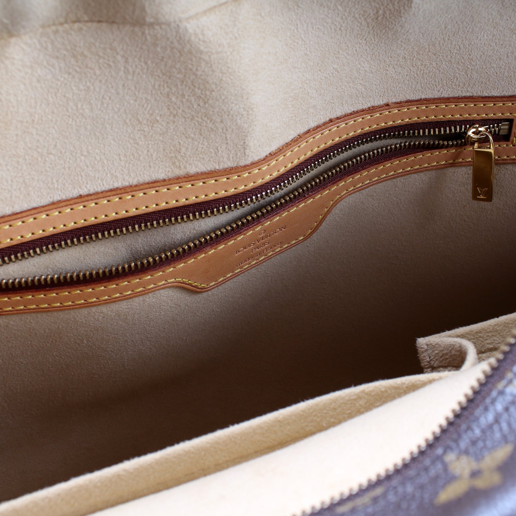 Exterior: The exterior Monogram coated canvas is free of any rips or cracks. The exterior features one zip closure pocket. The corners and leather details show minor wear.