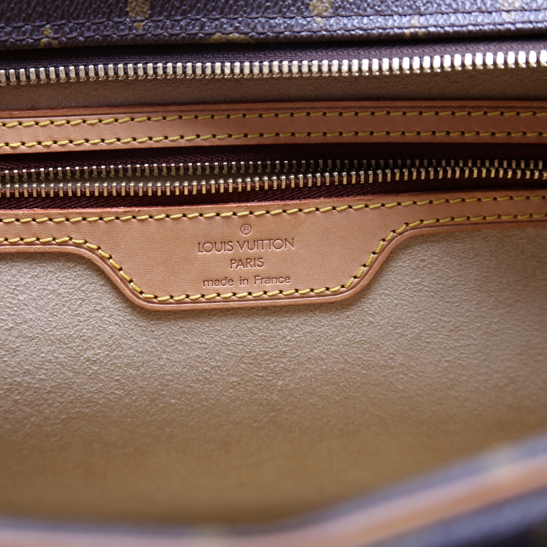 Exterior: The exterior Monogram coated canvas is free of any rips or cracks. The exterior features one zip closure pocket. The leather trim shows minor discoloration.