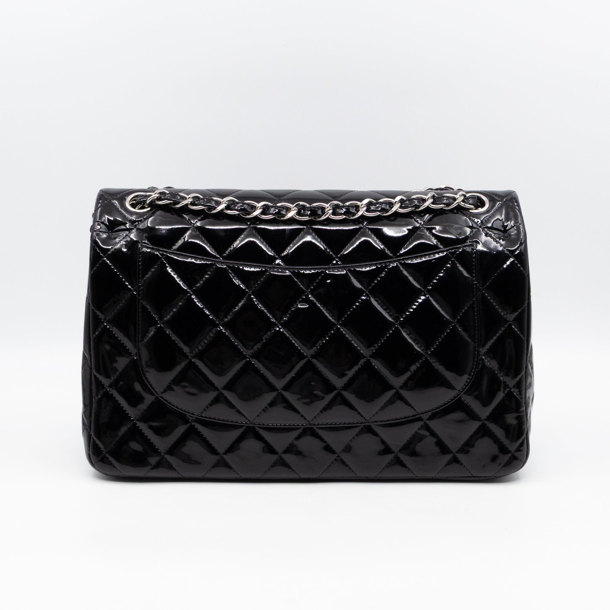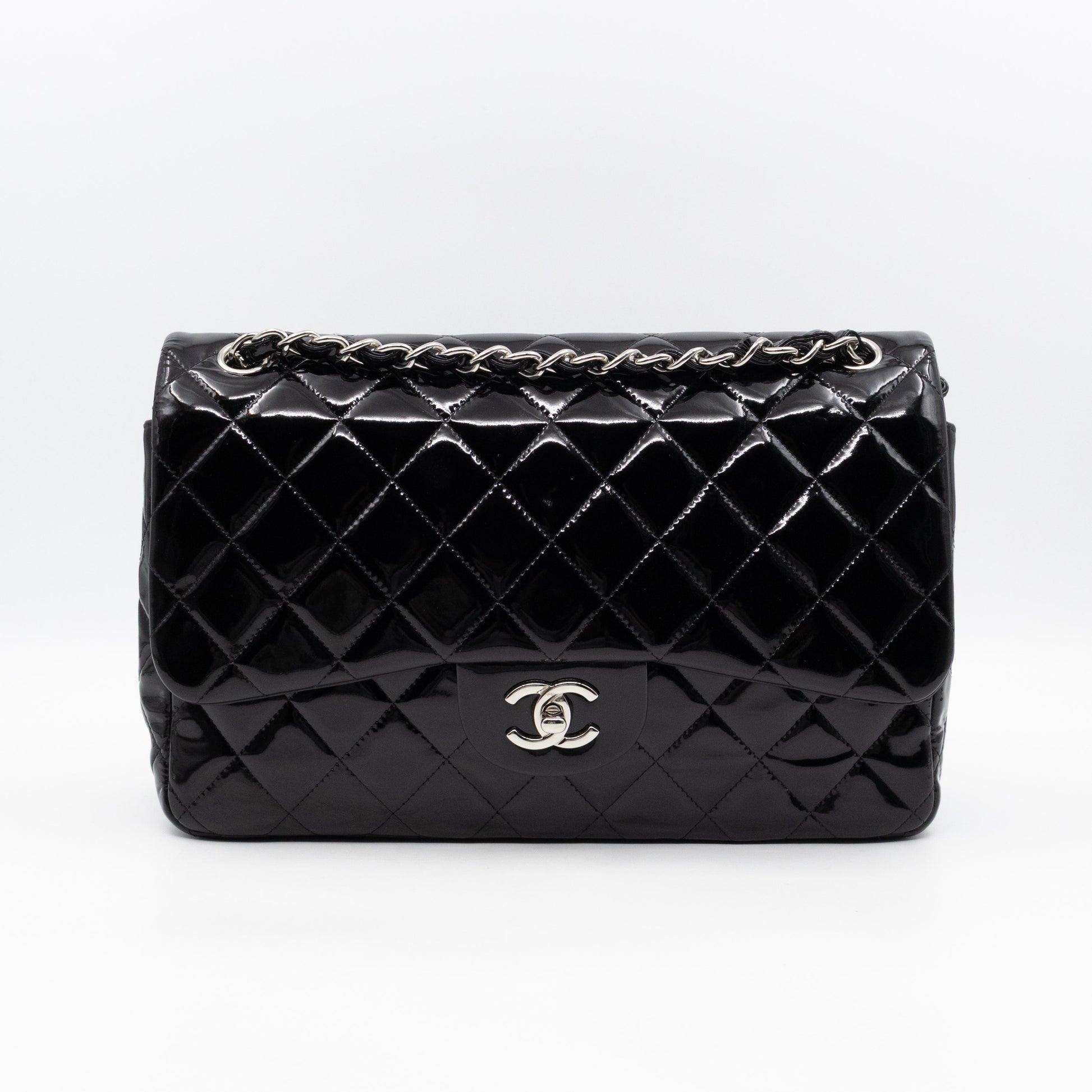 This is the classic Chanel double flap bag in jumbo size. This large timeless classic is made with black patent leather and silver-tone hardware. With the jumbo classic you can carry all your daily and work essentials in a timeless fashion. Can be worn crossbody or single shoulder. Current retail price for this model is €11100.