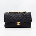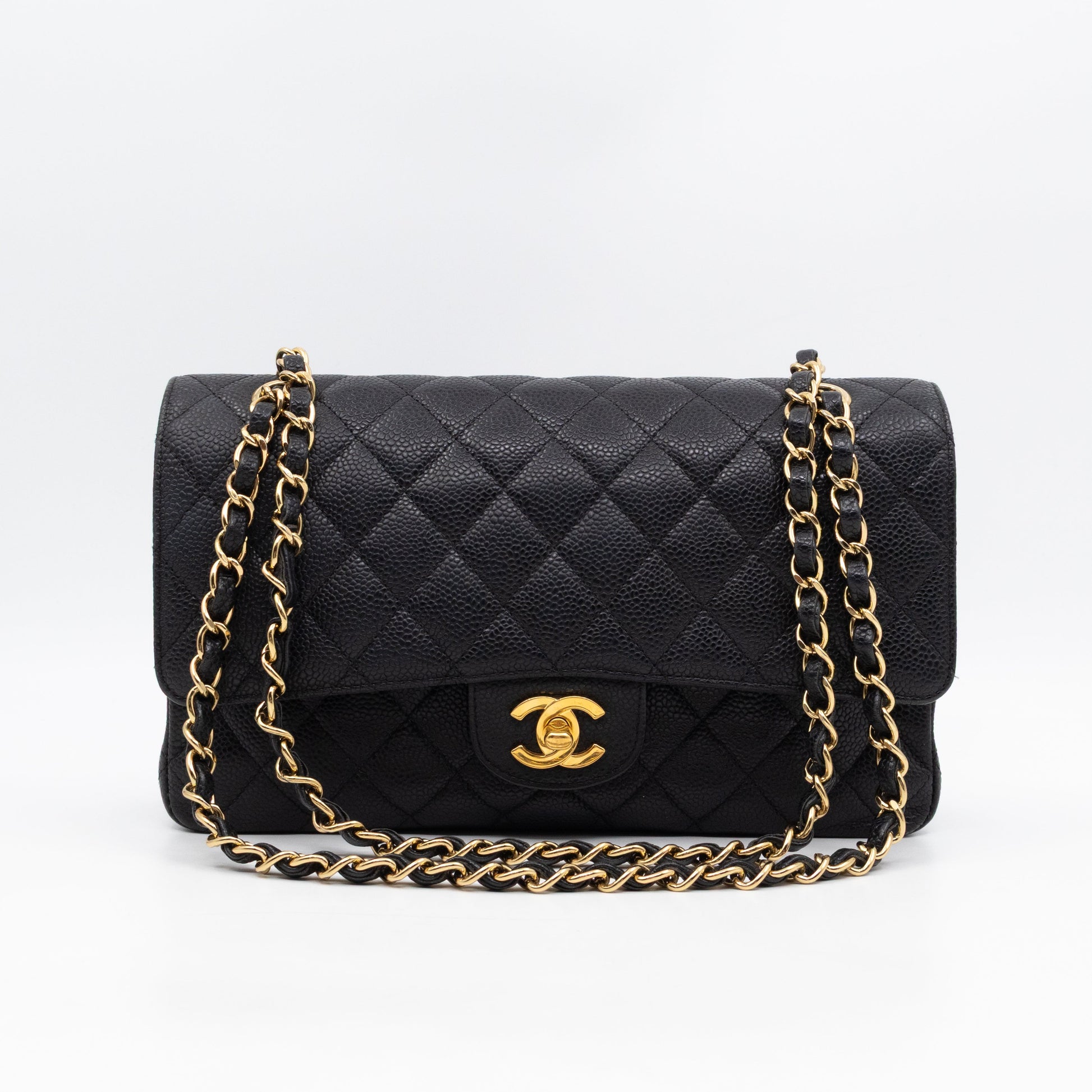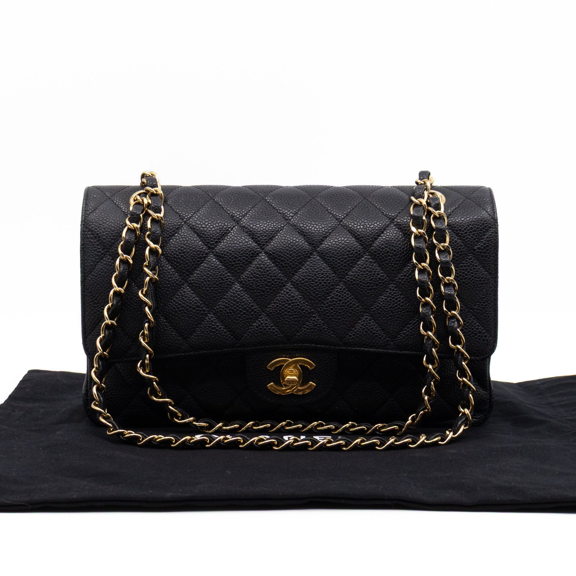 This is the classic Chanel double flap bag in the most wanted medium size (25.5 cm). This timeless classic is made with diamond quilted black caviar leather and gold-tone hardware. Inside lining in black leather. With the medium classic bag you can carry all your daily in a timeless fashion. Current retail price is €10300.