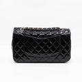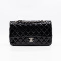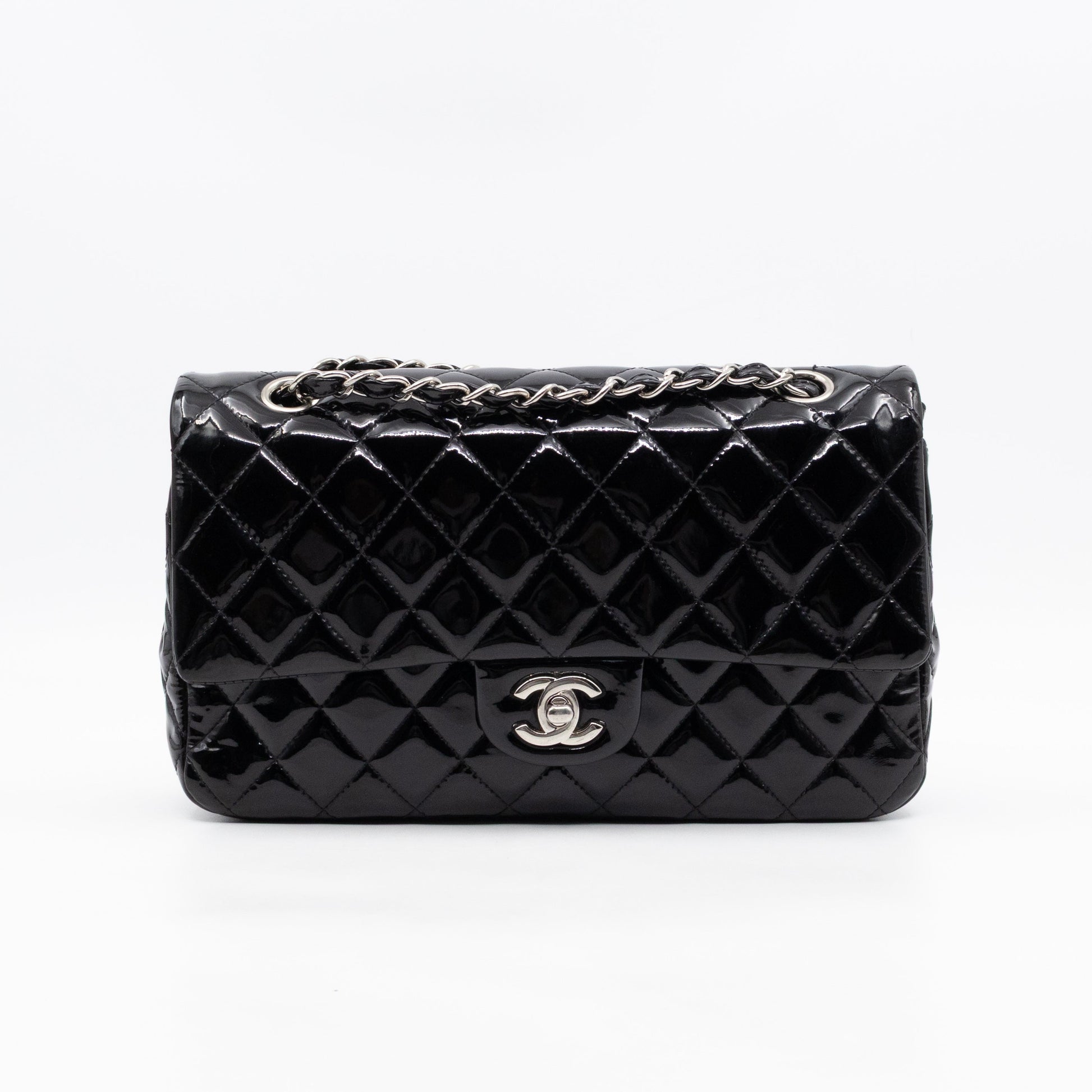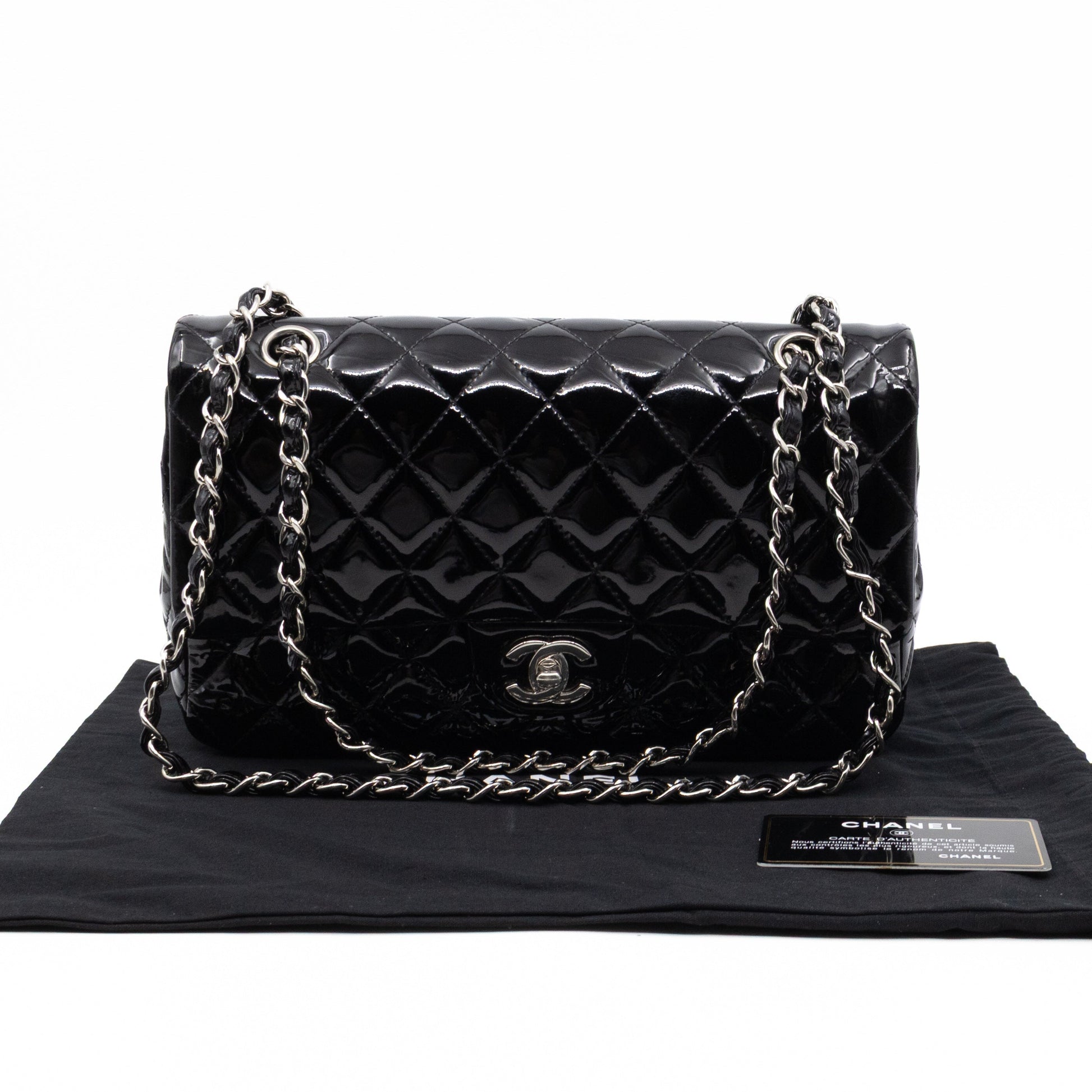 This is the classic Chanel double flap bag in the most wanted medium size (25.5 cm). This timeless classic is made with diamond quilted black patent leather and silver-tone hardware. Inside lining in black leather. With the medium classic bag you can carry all your daily in a timeless fashion. Current retail price €9700.