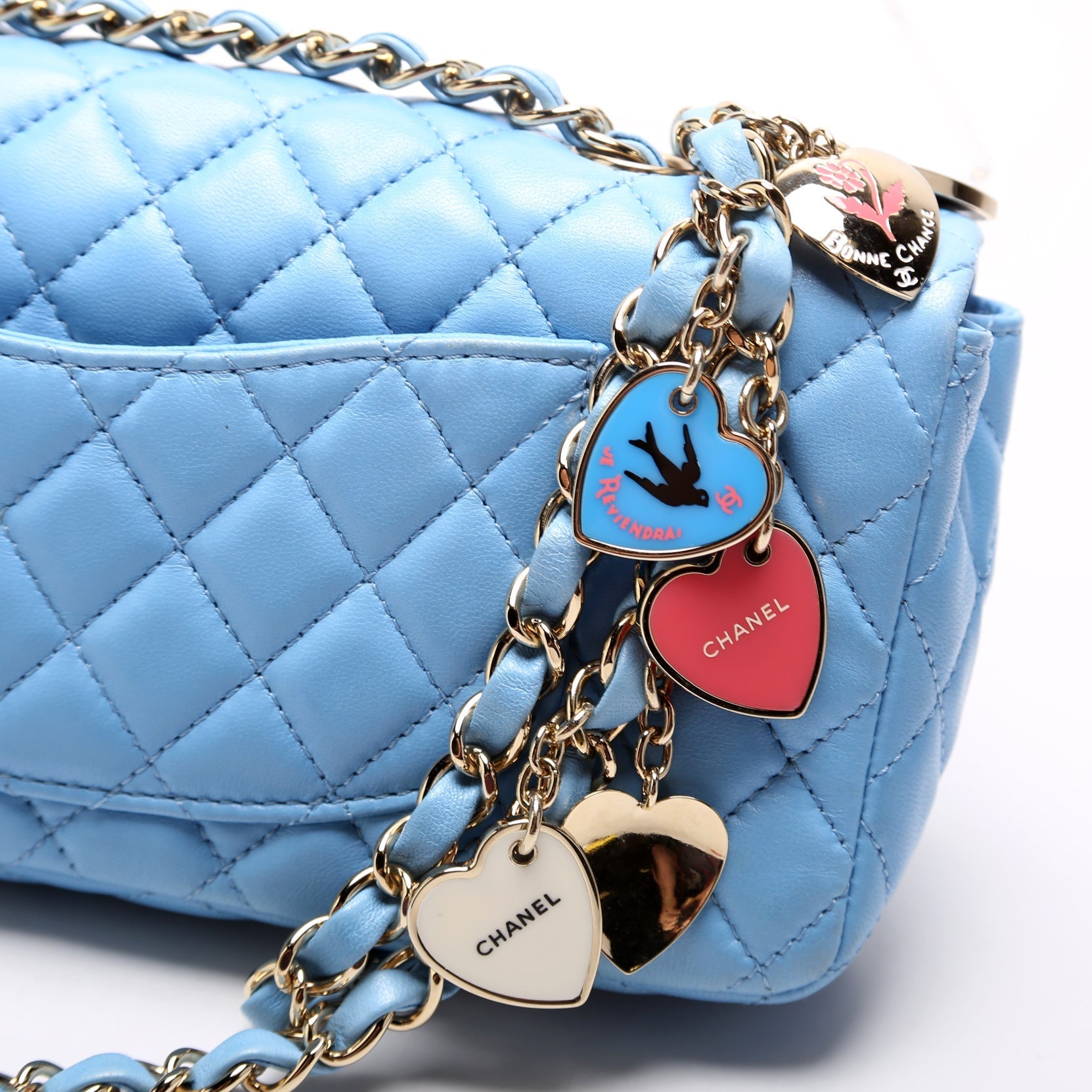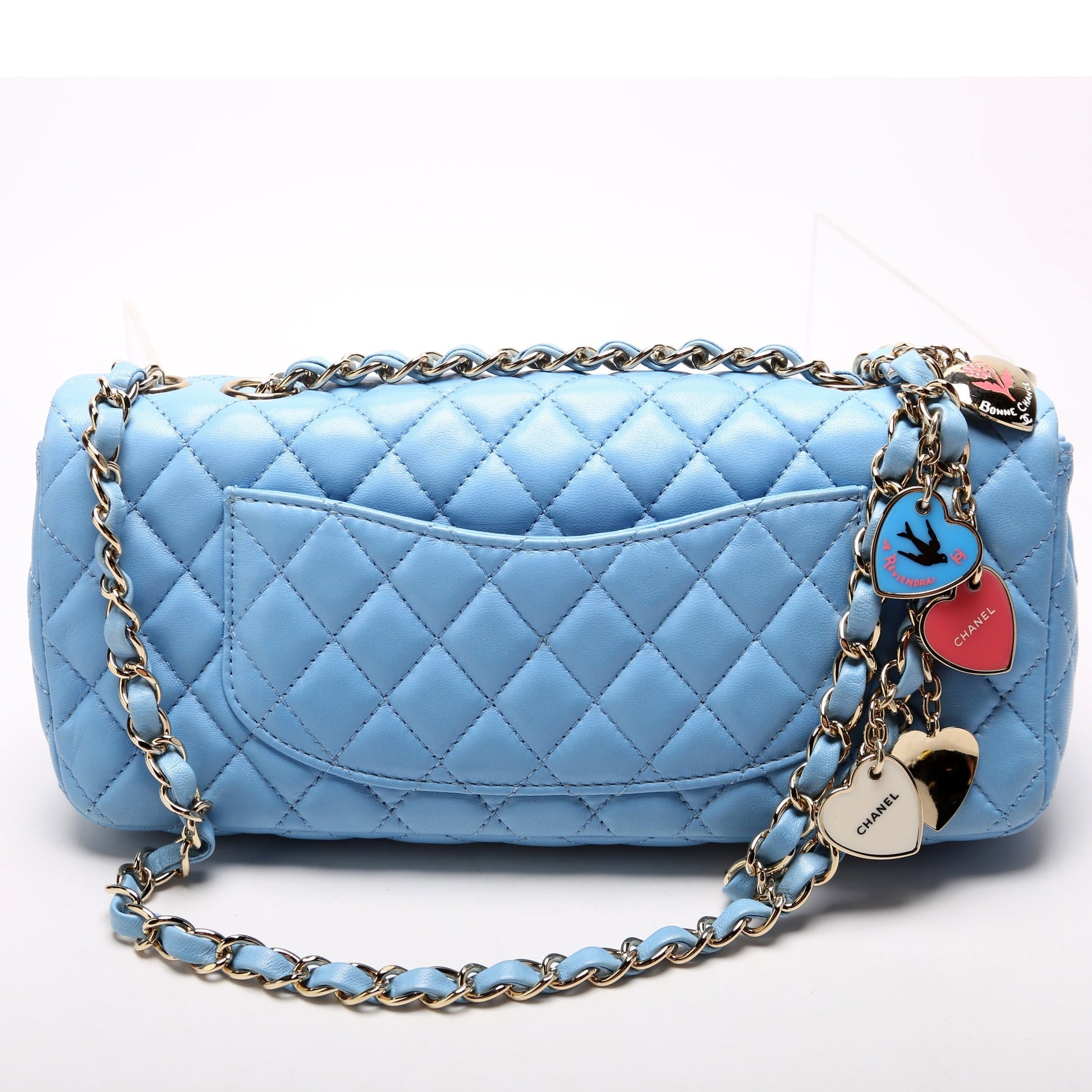 This Chanel Classic E/W Valentine Charms Flap Bag is d 100% . The exterior is in the classic Chanel Lambskin leather.