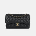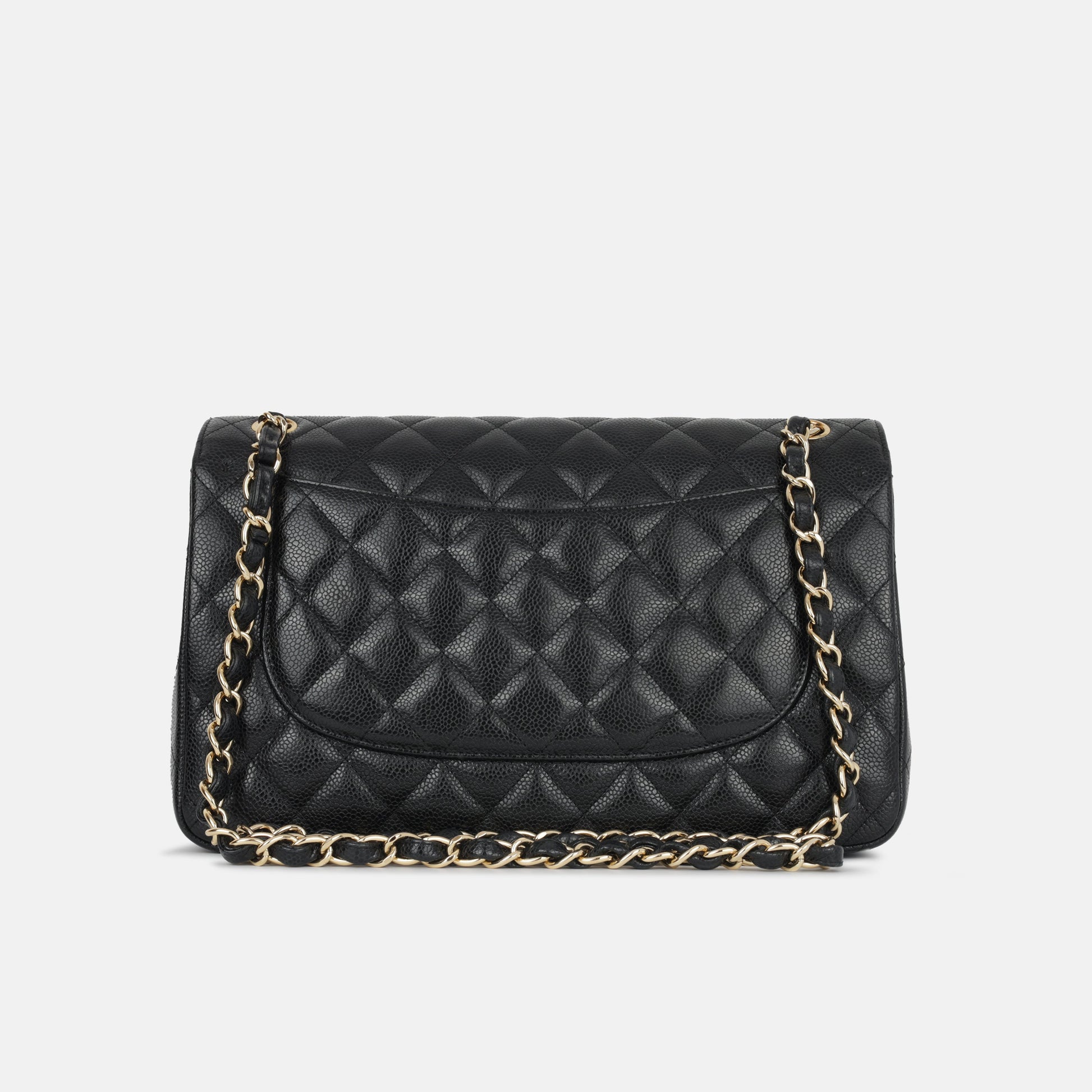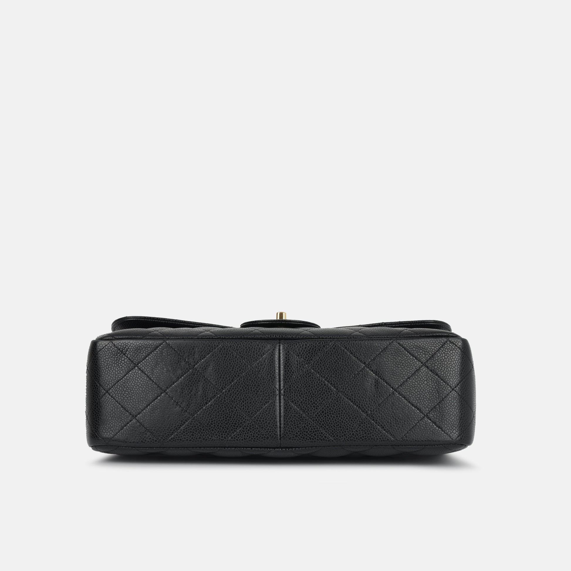 Chanel continues to present its signature line of Classic Flap bags. Under the creative direction of Karl Lagerfeld, the Classic Flap is perhaps the most acclaimed bag in all of fashion history. Timeless, elegant and sophisticated, it's no wonder the Classic Flap is, well, a classic. Featuring its infamous quilted caviar leather and interwoven chain / leather strap, the Jumbo is an absolute must-have in any luxury handbag collection. Not only is this highly coveted, stunning black bag the perfect compliment to pretty much anything you have in your wardrobe, but it's also an investment piece that will never lose its value.
