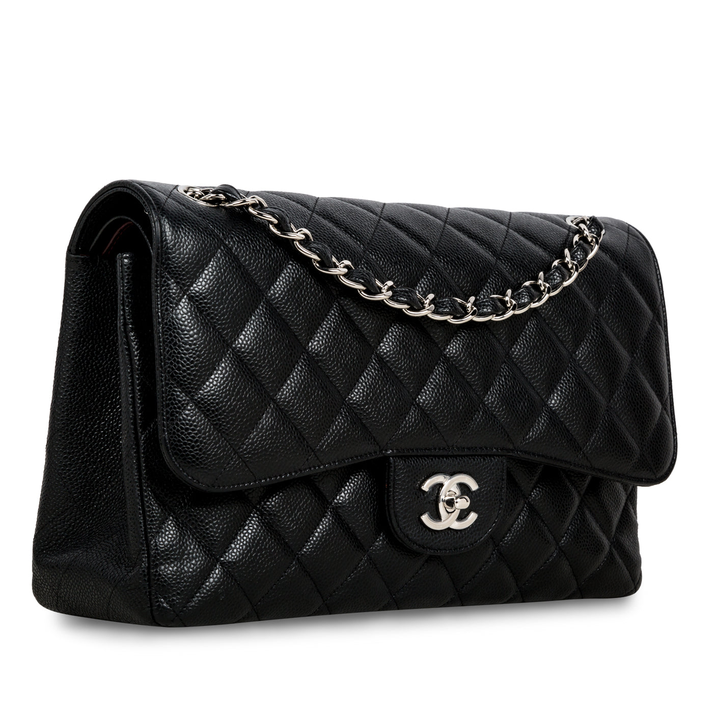 Chanel continues to present its signature line of Classic Flap bags. Under the creative direction of Karl Lagerfeld, the Classic Flap is perhaps the most acclaimed bag in all of fashion history. Timeless, elegant and sophisticated, it's no wonder the Classic Flap is, well, a classic. Featuring its infamous quilted caviar leather and interwoven chain / leather strap, the Jumbo is an absolute must-have in any luxury handbag collection. Not only is this highly coveted, stunning black bag the perfect compliment to pretty much anything you have in your wardrobe, but it's also an investment piece that will never lose its value. Embodying elegance and traditional femininity to a T, a Chanel bag is a purchase you won't ever regret.