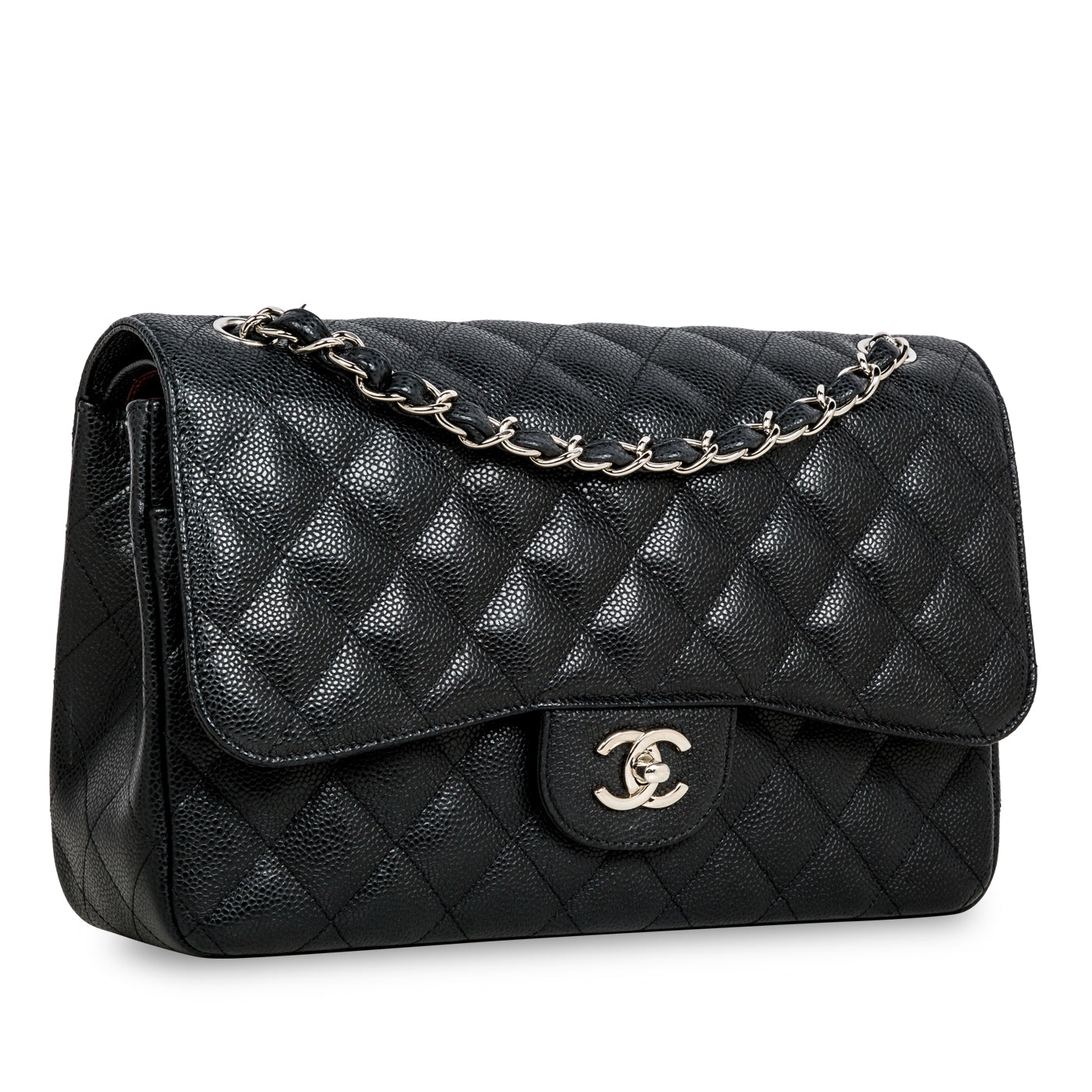 Chanel continues to present its signature line of Classic Flap bags. Under the creative direction of Karl Lagerfeld, the Classic Flap is perhaps the most acclaimed bag in all of fashion history. Timeless, elegant and sophisticated, it's no wonder the Classic Flap is, well, a classic. Featuring its infamous quilted caviar leather and interwoven chain / leather strap, the Jumbo is an absolute must-have in any luxury handbag collection. Not only is this highly coveted, stunning black bag the perfect compliment to pretty much anything you have in your wardrobe, but it's also an investment piece that will never lose its value. Embodying elegance and traditional femininity to a T, a Chanel bag is a purchase you won't ever regret.