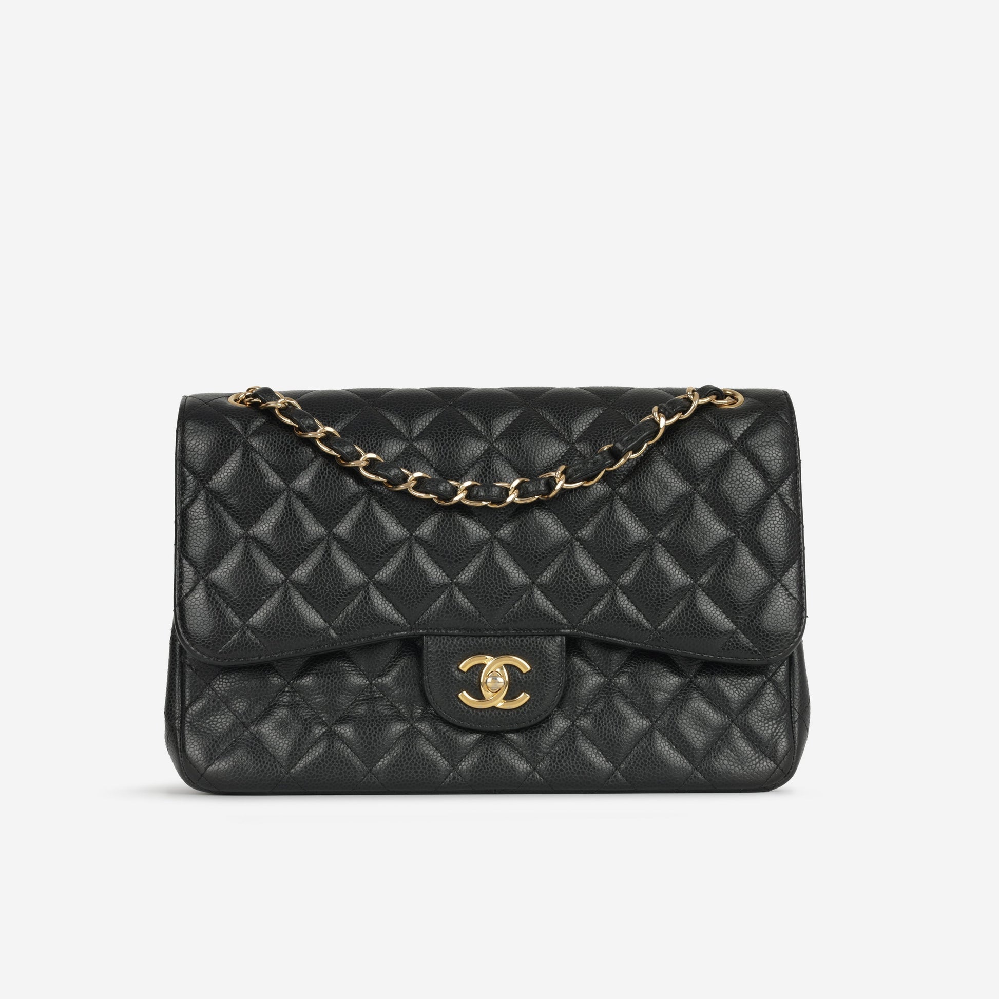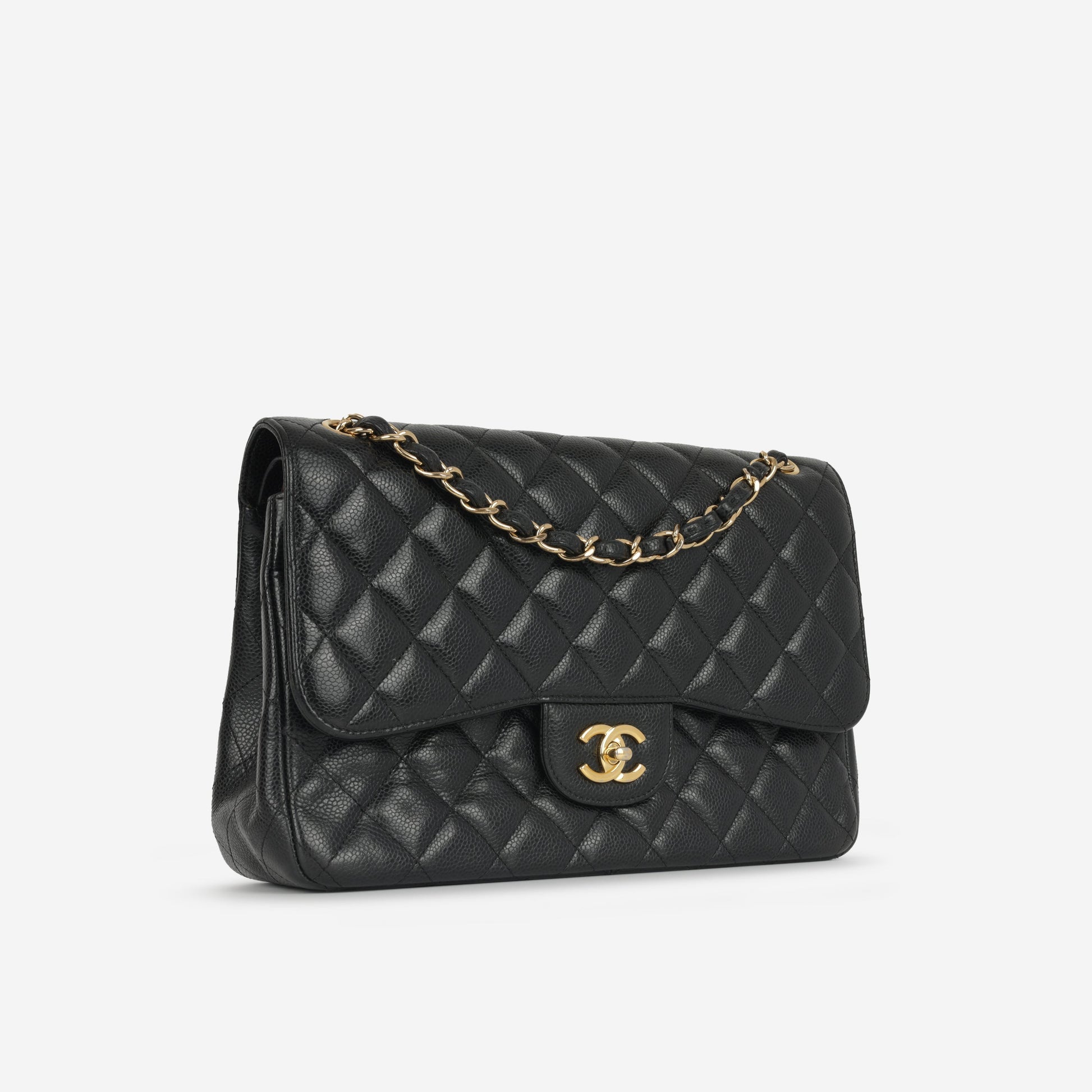 Chanel continues to present its signature line of Classic Flap bags. Under the creative direction of Karl Lagerfeld, the Classic Flap is perhaps the most acclaimed bag in all of fashion history. Timeless, elegant and sophisticated, it's no wonder the Classic Flap is, well, a classic. Featuring its infamous quilted caviar leather and interwoven chain / leather strap, the Jumbo is an absolute must-have in any luxury handbag collection. Not only is this highly coveted, stunning black bag the perfect compliment to pretty much anything you have in your wardrobe, but it's also an investment piece that will never lose its value.