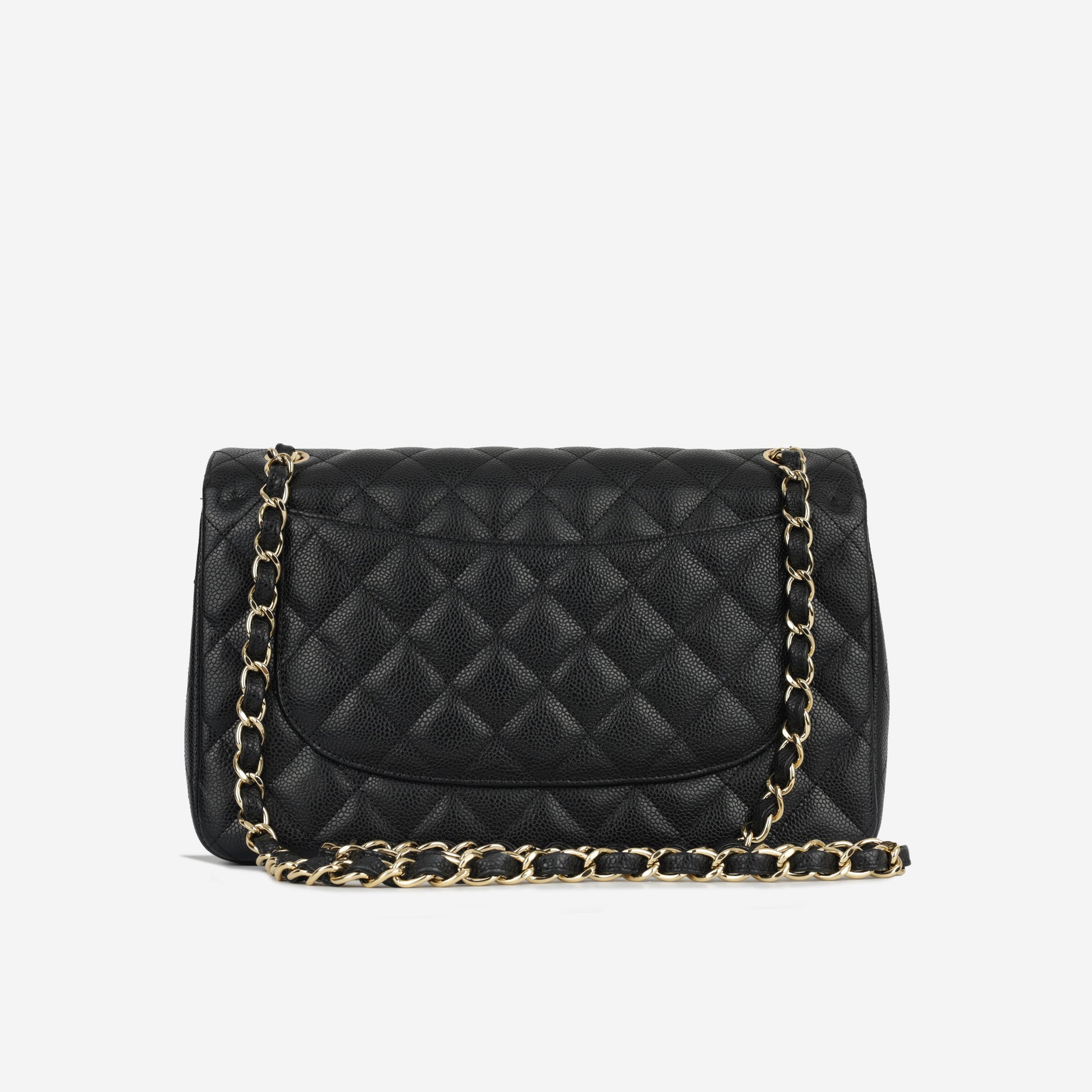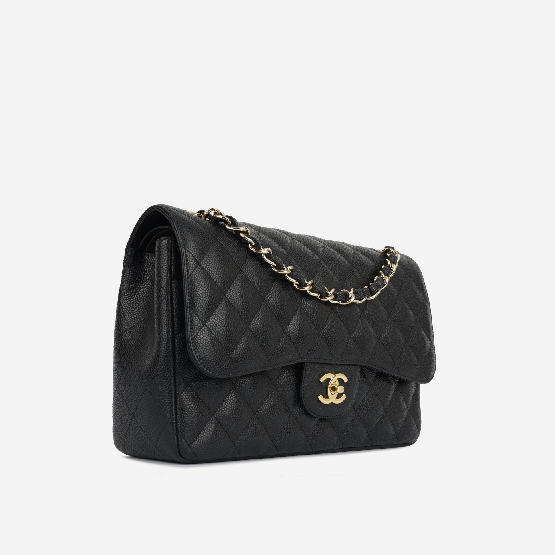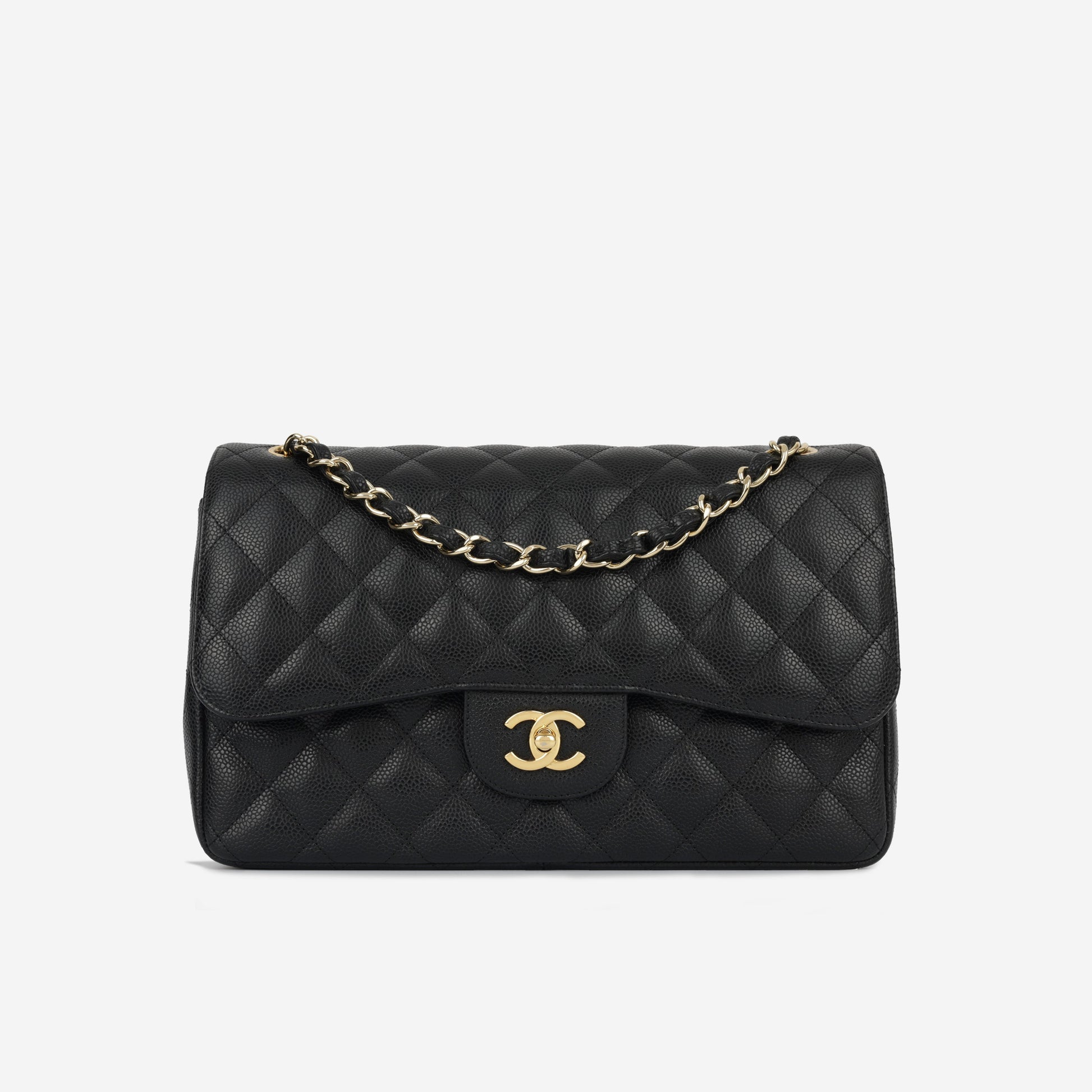 Chanel continues to present its signature line of Classic Flap bags. Under the creative direction of Karl Lagerfeld, the Classic Flap is perhaps the most acclaimed bag in all of fashion history. Timeless, elegant and sophisticated, it's no wonder the Classic Flap is, well, a classic. Featuring its infamous quilted caviar leather and interwoven chain / leather strap, the Jumbo is an absolute must-have in any luxury handbag collection. Not only is this highly coveted, stunning black bag the perfect compliment to pretty much anything you have in your wardrobe, but it's also an investment piece that will never lose its value.