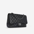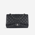 Chanel continues to present its signature line of Classic Flap bags. Under the creative direction of Karl Lagerfeld, the Classic Flap is perhaps the most acclaimed bag in all of fashion history. Timeless, elegant and sophisticated, it's no wonder the Classic Flap is, well, a classic. Featuring its infamous quilted caviar leather and interwoven chain / leather strap, the Jumbo is an absolute must-have in any luxury handbag collection. Not only is this highly coveted, stunning black bag the perfect compliment to pretty much anything you have in your wardrobe, but it's also an investment piece that will never lose its value.