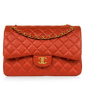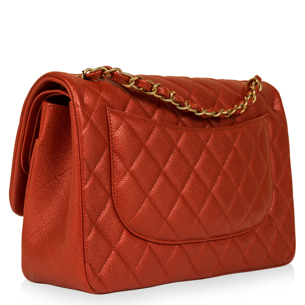 Chanel continues to present its signature line of Classic Flap bags. Under the creative direction of Karl Lagerfeld, the Classic Flap is perhaps the most acclaimed bag in all of fashion history. Timeless, elegant and sophisticated, it's no wonder the Classic Flap is, well, a classic. Featuring its infamous quilted caviar leather and interwoven chain / leather strap, the Jumbo is an absolute must-have in any luxury handbag collection. Not only is this highly coveted, this stunning Pearlescent Red Caviar beauty will be the perfect stand out accessory for any of your go to outfits. To top that off, it's also an investment piece that will never lose its value. Embodying elegance and traditional femininity to a T, a Chanel bag is a purchase you won't ever regret.