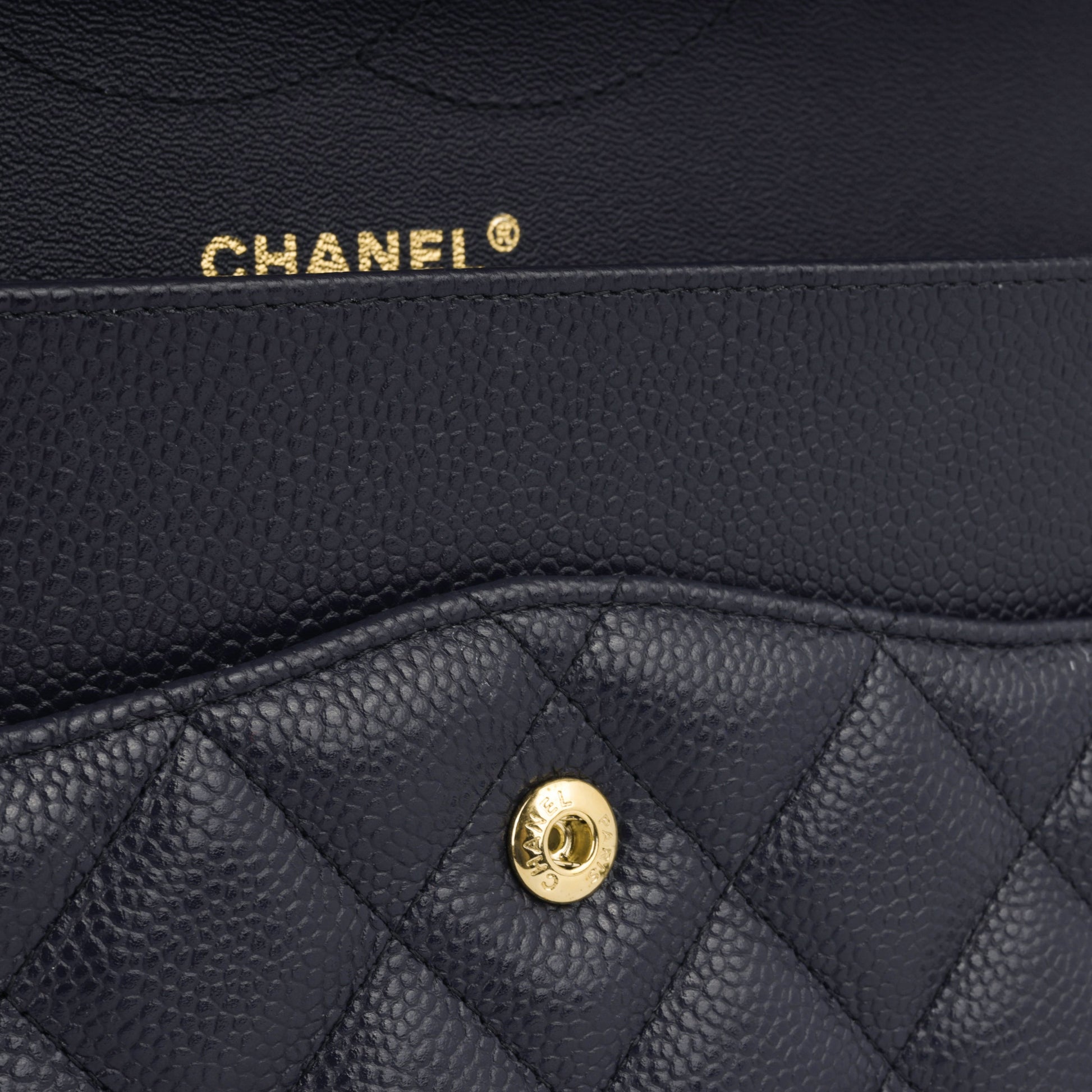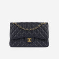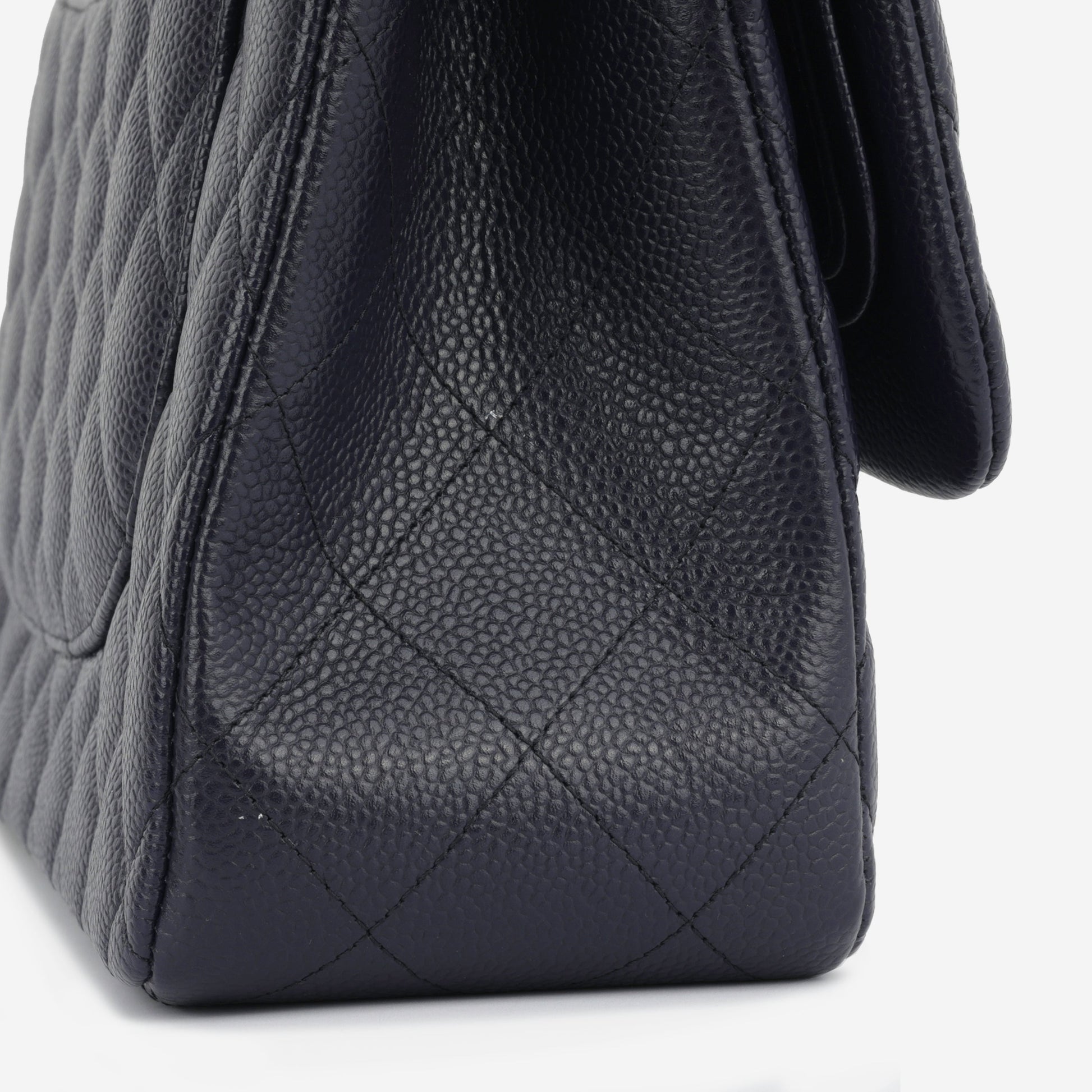 Chanel continues to present its signature line of Classic Flap bags. Under the creative direction of Karl Lagerfeld, the Classic Flap is perhaps the most acclaimed bag in all of fashion history. Timeless, elegant and sophisticated, it's no wonder the Classic Flap is, well, a classic. Featuring its infamous quilted caviar leather and interwoven chain / leather strap, the Jumbo is an absolute must-have in any luxury handbag collection. Not only is this highly coveted, stunning black bag the perfect compliment to pretty much anything you have in your wardrobe, but it's also an investment piece that will never lose its value.
