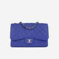 Chanel continues to present its signature line of Classic Flap bags. Under the creative direction of Karl Lagerfeld, the Classic Flap is perhaps the most acclaimed bag in all of fashion history. Timeless, elegant and sophisticated, it's no wonder the Classic Flap is, well, a classic. Featuring its infamous quilted caviar leather and interwoven chain / leather strap, the Jumbo is an absolute must-have in any luxury handbag collection.