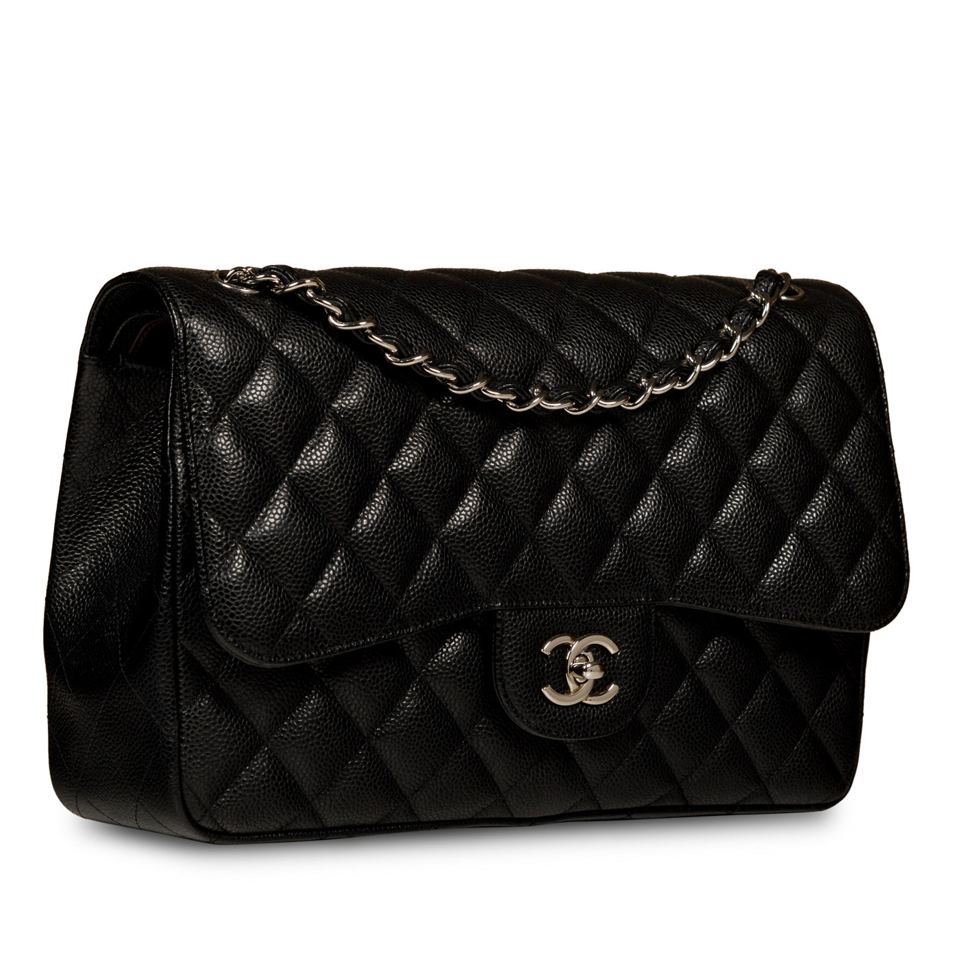 Chanel continues to present its signature line of Classic Flap bags. Under the creative direction of Karl Lagerfeld, the Classic Flap is perhaps the most acclaimed bag in all of fashion history. Timeless, elegant and sophisticated, it's no wonder the Classic Flap is, well, a classic. Featuring its infamous quilted caviar leather and interwoven chain / leather strap, the Jumbo is an absolute must-have in any luxury handbag collection. Not only is this highly coveted, stunning black bag the perfect compliment to pretty much anything you have in your wardrobe, but it's also an investment piece that will never lose its value. Embodying elegance and traditional femininity to a T, a Chanel bag is a purchase you won't ever regret.
