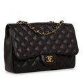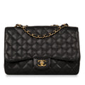 Chanel continues to present its signature line of Classic Flap bags. Under the creative direction of Karl Lagerfeld, the Classic Flap is perhaps the most acclaimed bag in all of fashion history. Timeless, elegant and sophisticated, it's no wonder the Classic Flap is, well, a classic. Featuring its infamous quilted caviar leather and interwoven chain / leather strap, the Jumbo is an absolute must-have in any luxury handbag collection. Not only is this highly coveted, this stunning black bag the perfect compliment to pretty much anything you may own in your wardrobe, but it's also an investment piece that will never lose its value. Embodying elegance and traditional femininity to a T, a Chanel bag is a purchase you won't ever regret.