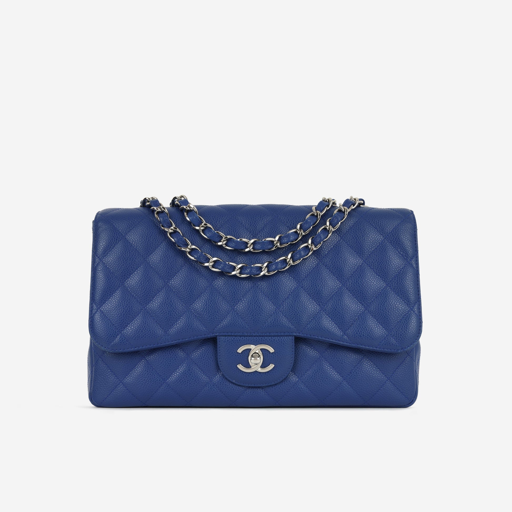 Chanel continues to present its signature line of Classic Flap bags. Under the creative direction of Karl Lagerfeld, the Classic Flap is perhaps the most acclaimed bag in all of fashion history. Timeless, elegant and sophisticated, it's no wonder the Classic Flap is, well, a classic. Featuring its infamous quilted caviar leather and interwoven chain / leather strap, the Jumbo is an absolute must-have in any luxury handbag collection.