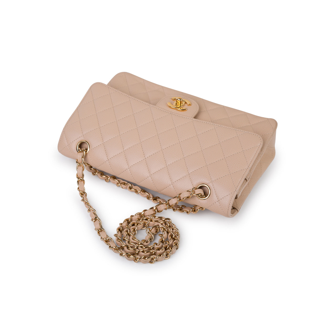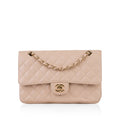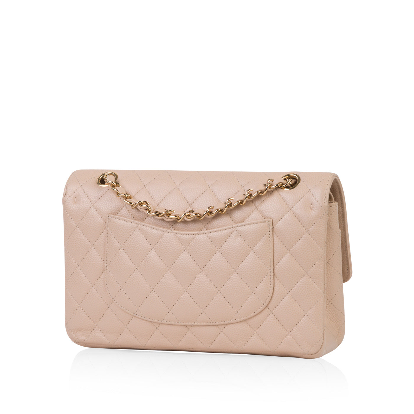 Under the creative direction of Karl Lagerfeld, Chanel continues with its line of classic quilted bags. The enviable Double Flap bag is crafted in strong and durable 'Caviar' leather, and detailed with fine stitching and silver hardware. The chain is interwoven with leather and can be worn on either a single shoulder strap or doubled up. The neutral color means this bag fits seamlessly into any wardrobe, and it can stay in there forever!