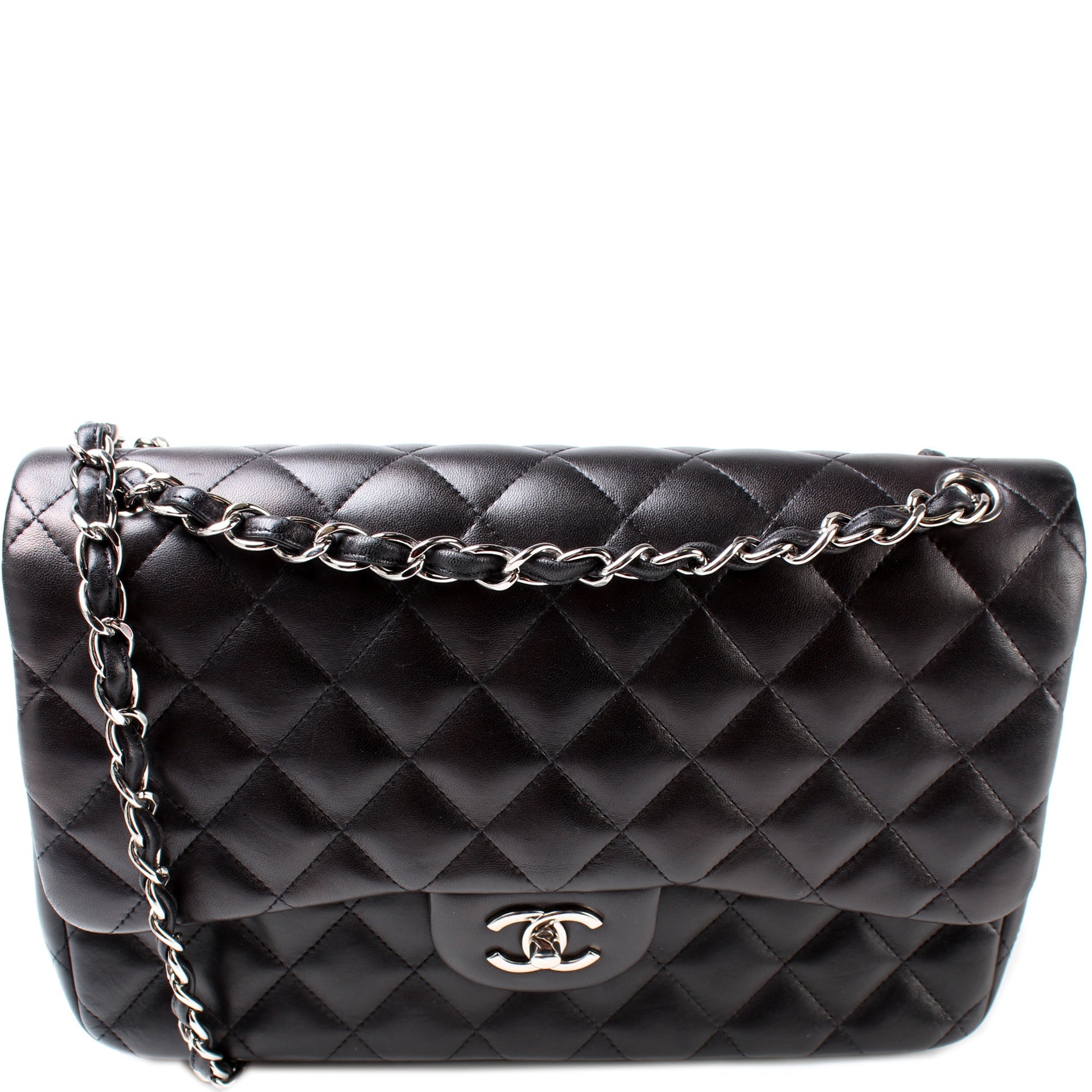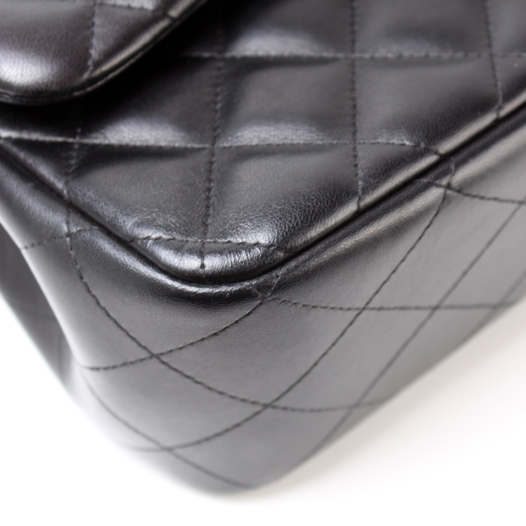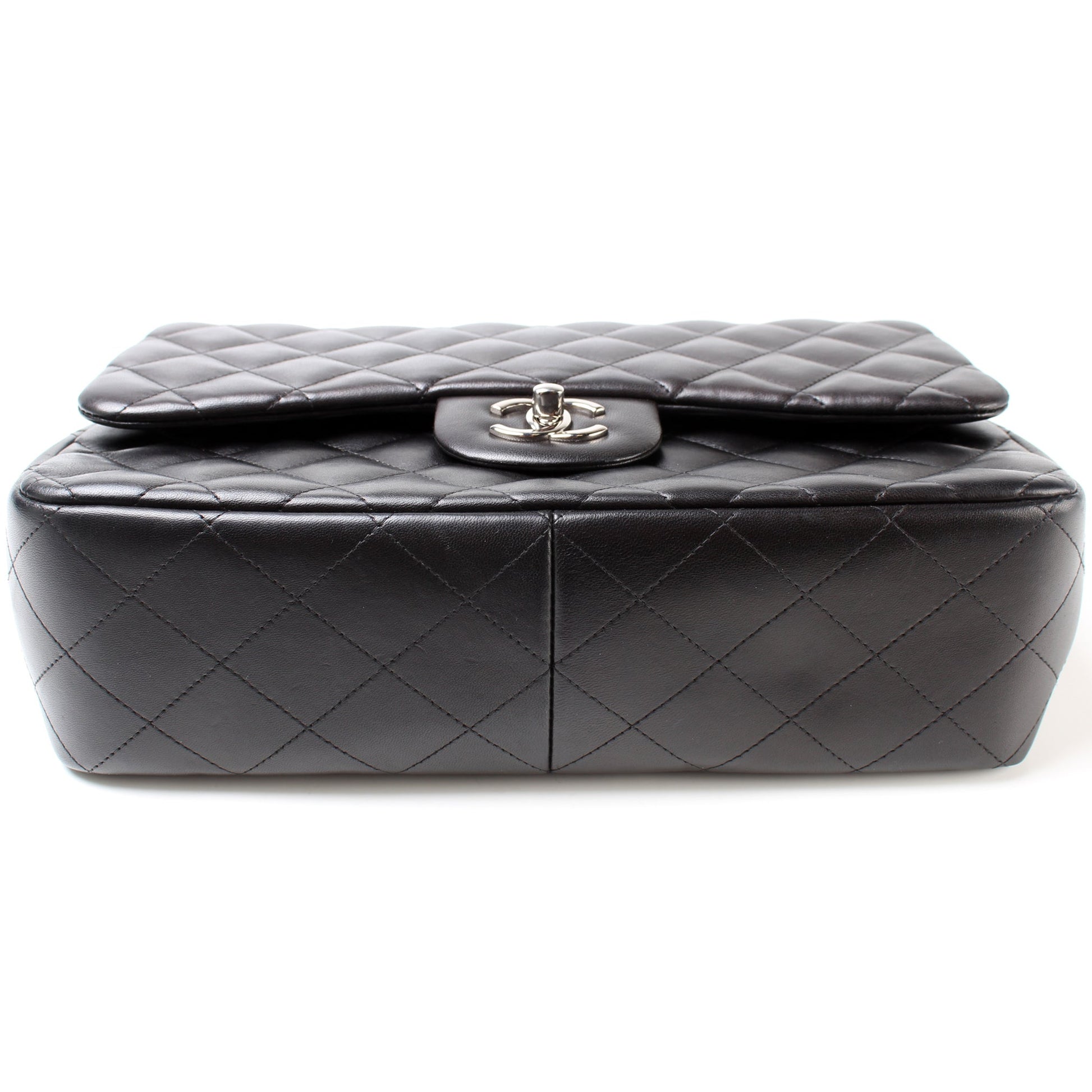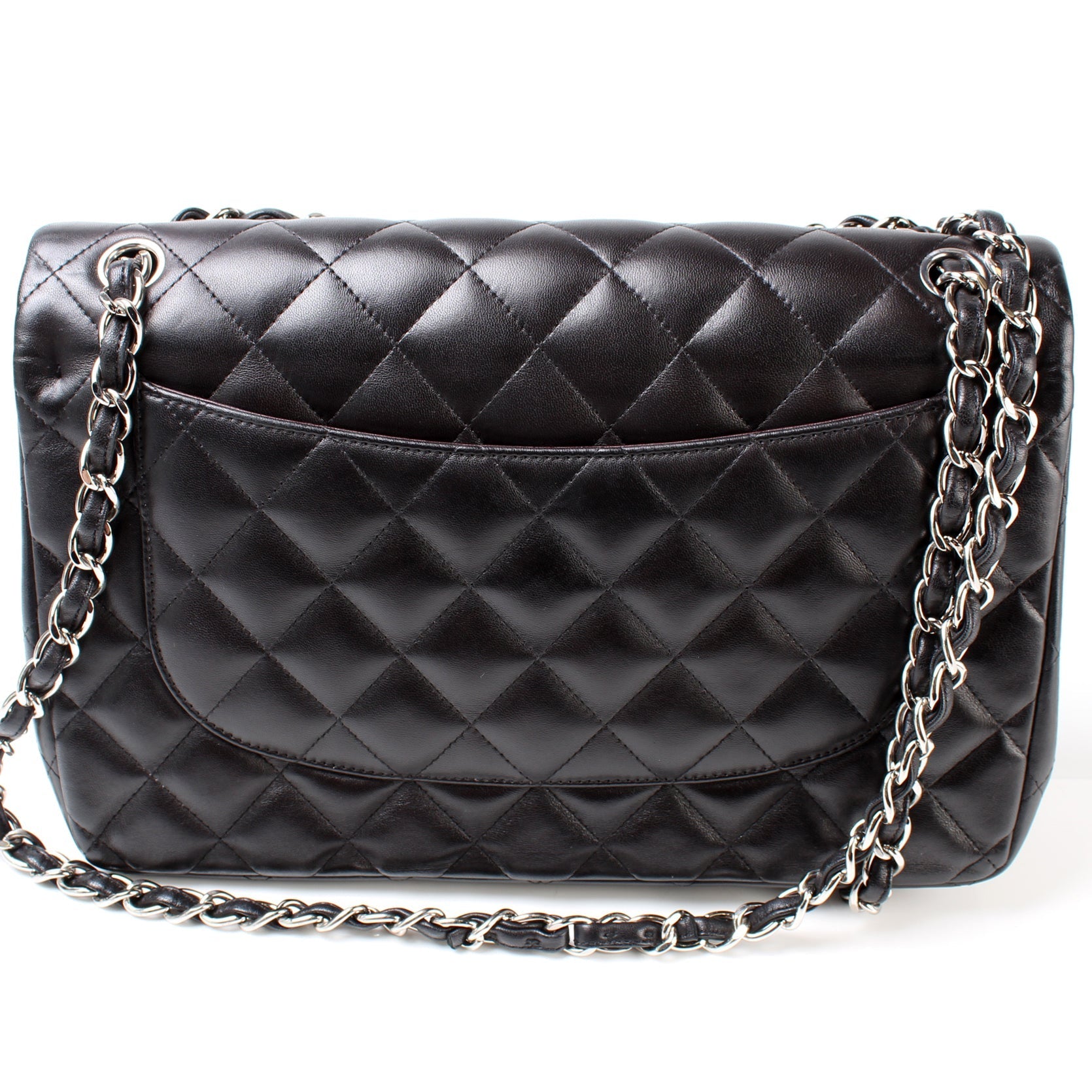 This Chanel Classic Flap Jumbo 17-20Mis eye catching bag. The exterior is in the classic Chanel lambskin leather.