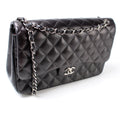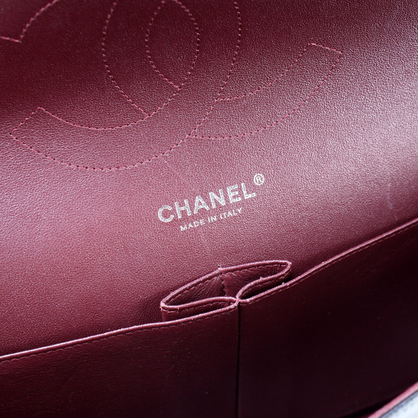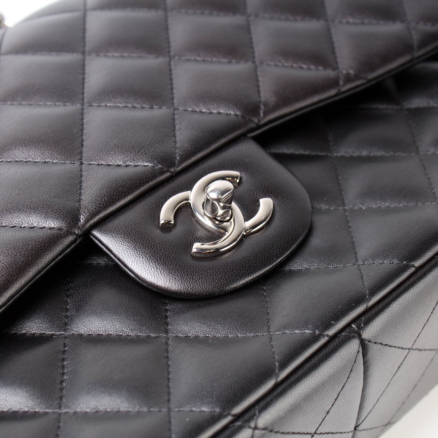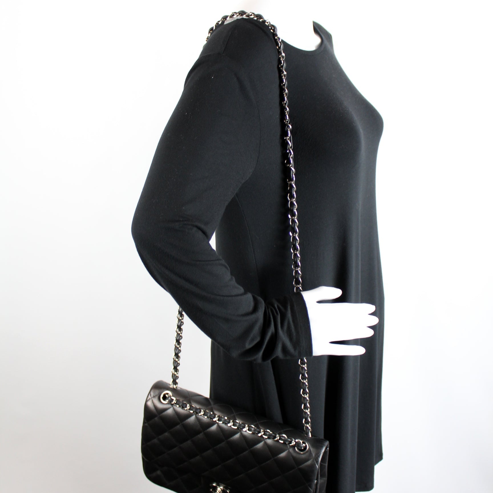 This Chanel Classic Flap Jumbo 17-20Mis eye catching bag. The exterior is in the classic Chanel lambskin leather.
