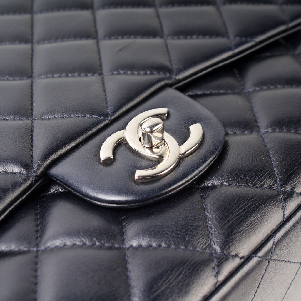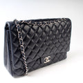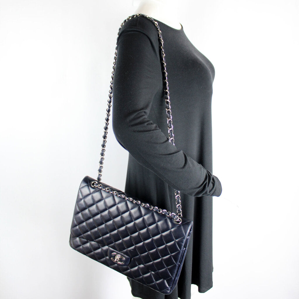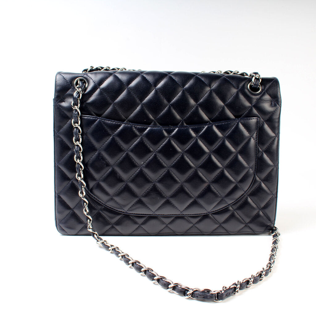 This Chanel Classic Flap Maxi Shoulder Bagis eye catching bag. The exterior is in the classic Chanel Lambskin leather.
