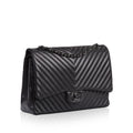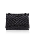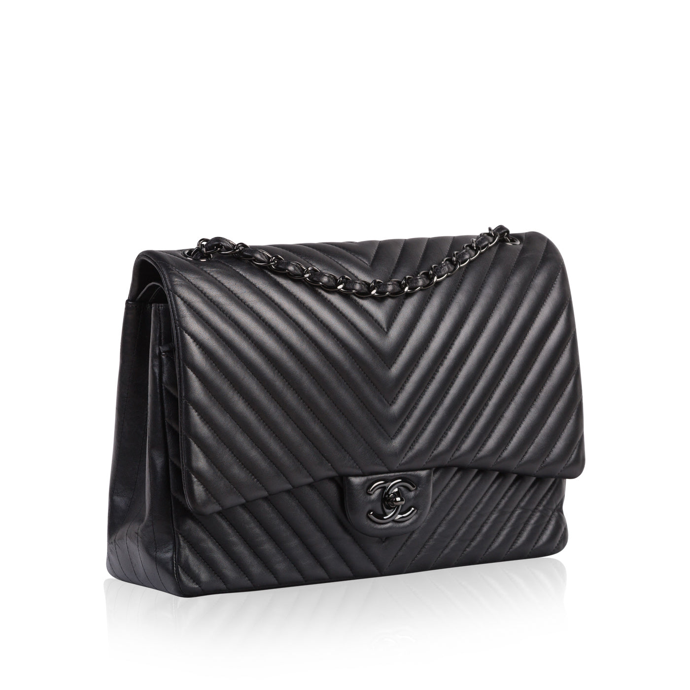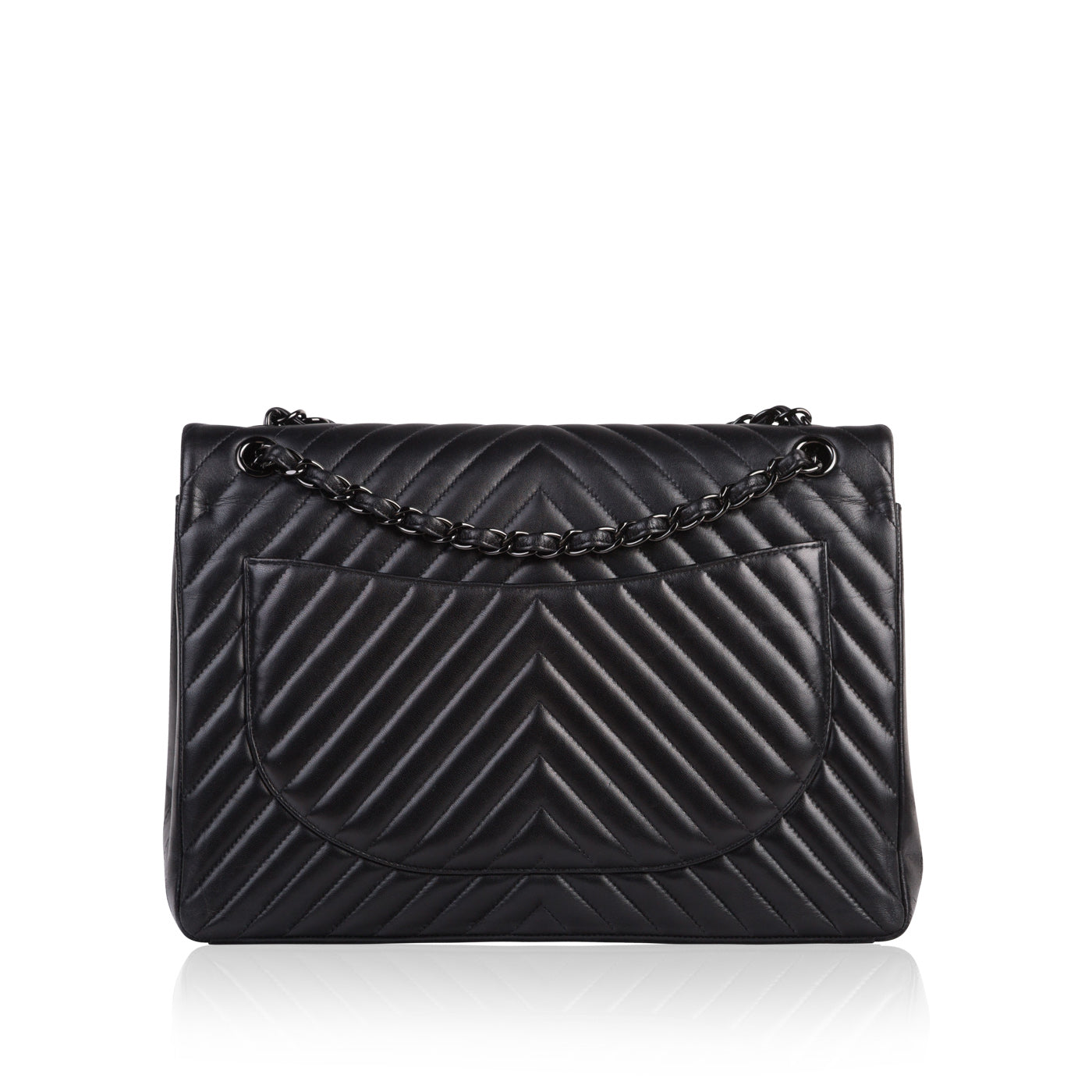 With the timelessness of a Classic Flap bag featuring a contemporary, edgy twist - the Chanel XL Chevron Flap bag is definitely not one to miss out on. Known for their abiding elegance and bags that will never go out of style, Chanel bags are one the most in-demand in the world. The unique and rare "So Black" double flap bag in chevron leather, is where modern meets classic by forming the perfect "elegantly edgy" shoulder bag that any woman can pull off. Wear this bag from day to night by dressing it up with a little black dress or dressing it down with jeans and a blazer. This is a true investment that any woman with a love for luxury, history, and fashion should own!
