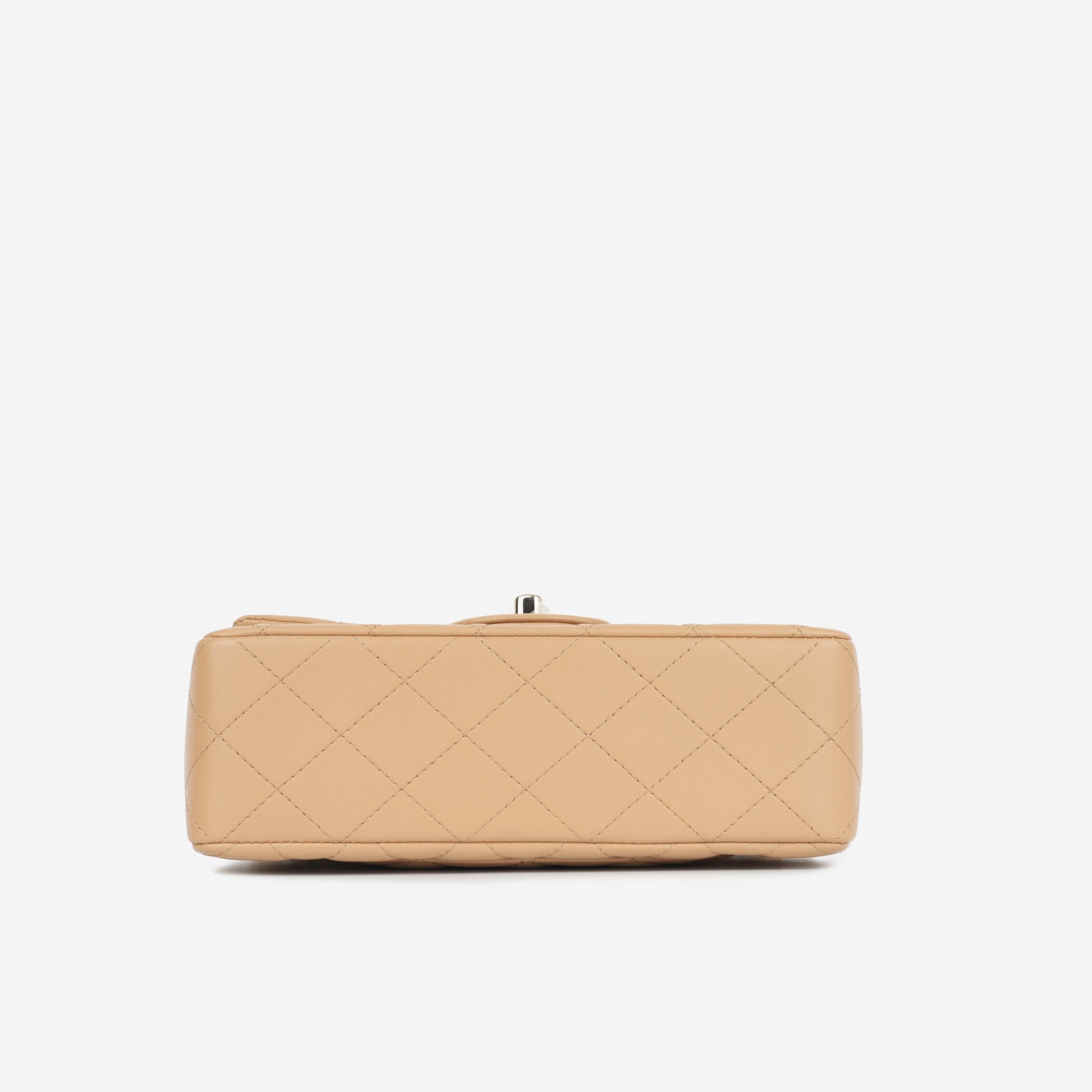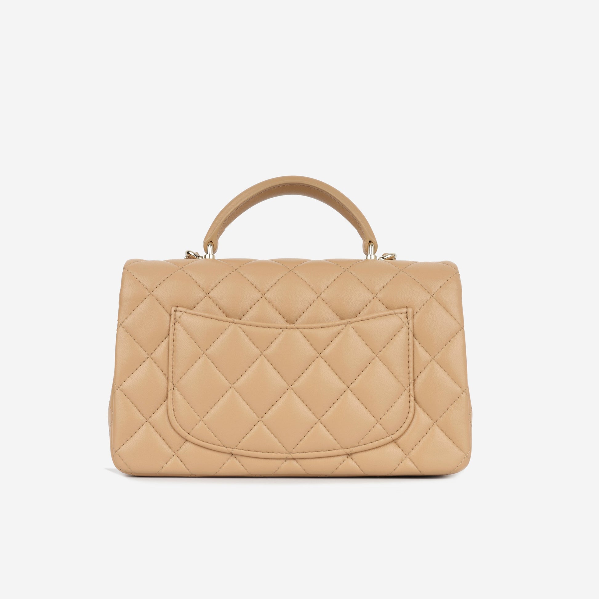 The mini rectangular Chanel flap bag comes with an updated feature of the top handle. Crafted from lambskin leather and coupled with champagne gold-tone hardware, this little Chanel is definitely hard to get your hands on.