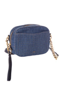 Coach Denim Studded Camera Cross-Body with gold studs, chain link detail strap and zipper for closure. This item is in good condition.