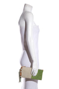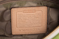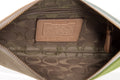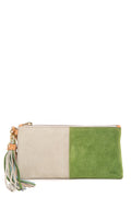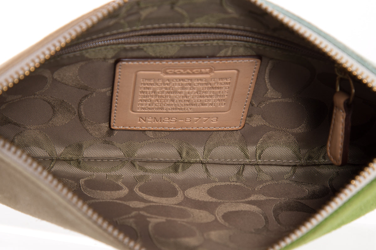 Coach color block suede hand bag with zipper closure at top and fringe tassel detail. This item is in good condition with some slight discoloring on corners.