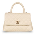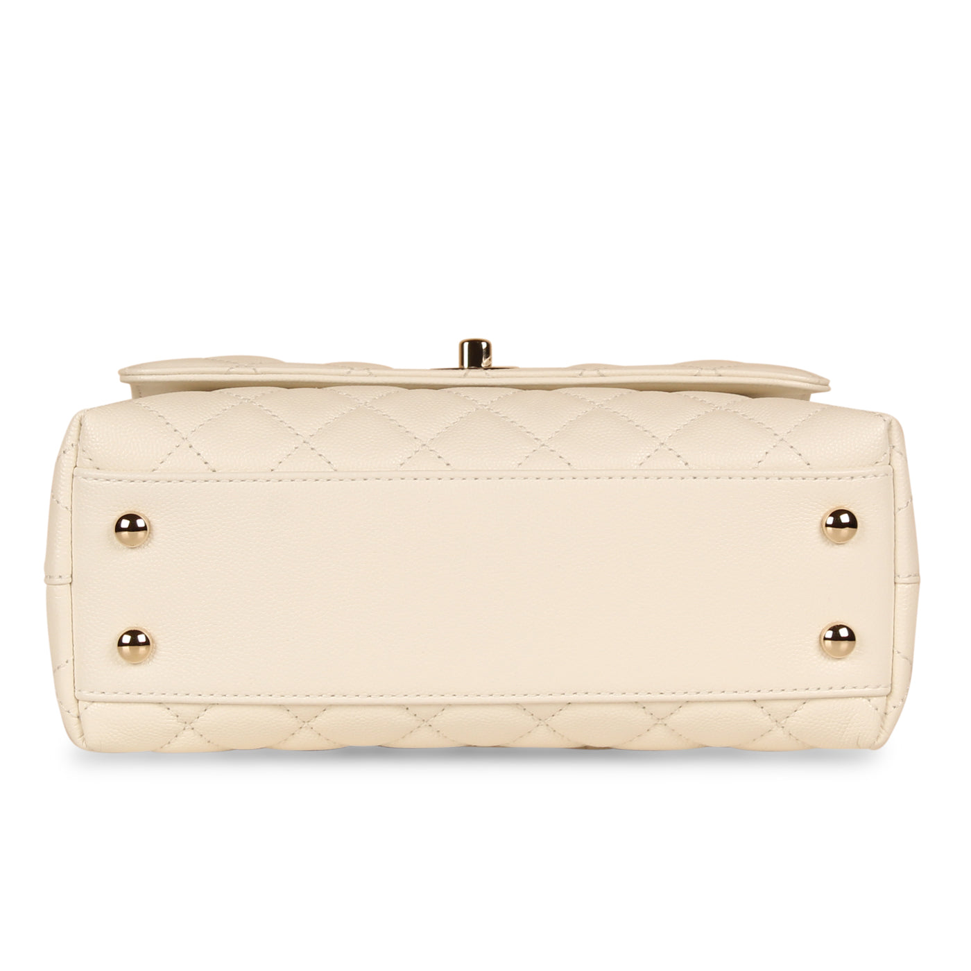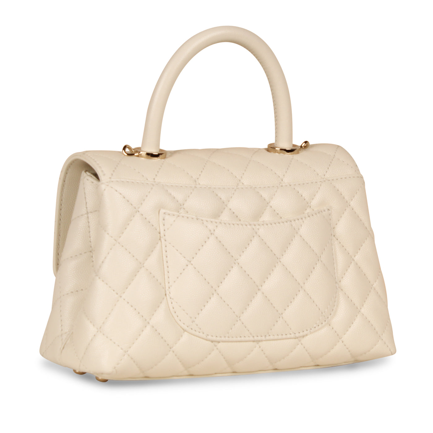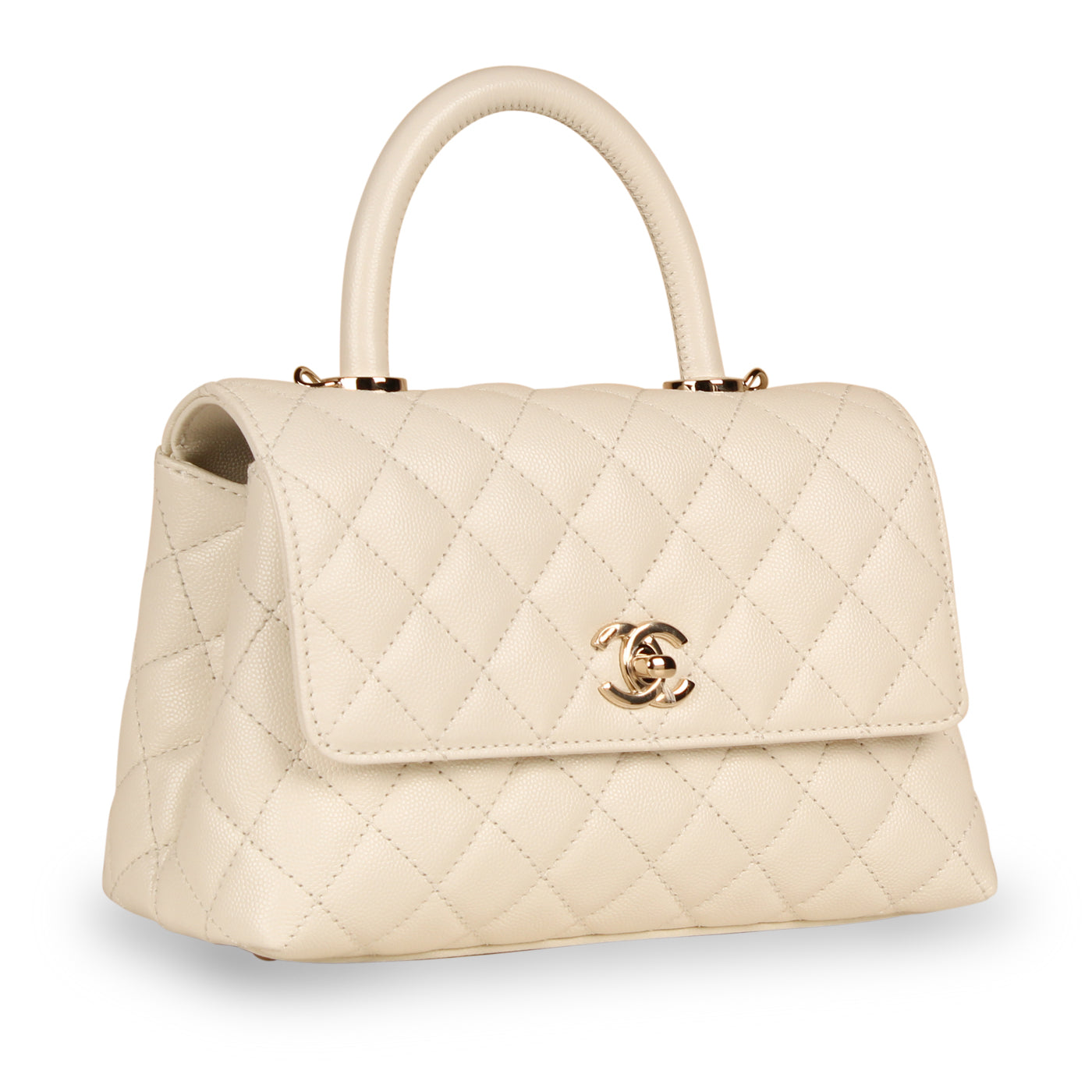 Crafted from caviar leather, Chanel presents the Small Coco Top Handle bag. Featuring champagne gold tone hardware, an interwoven chain / leather shoulder strap and a durable top handle, the Coco is the perfect balance between timeless elegance and modern edginess. Sophisticated and feminine yet perfectly in tune with modern fashion, this gorgeous bag is the ideal piece to compliment anything in your wardrobe. No matter the occasion, the Coco Top Handle can easily hold all your essentials from day to night while keeping you sleek and stylish. An investment piece you won't regret purchasing, this exquisite handbag is a true must-have for any woman with a love for luxury and a soft spot for Chanel.