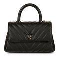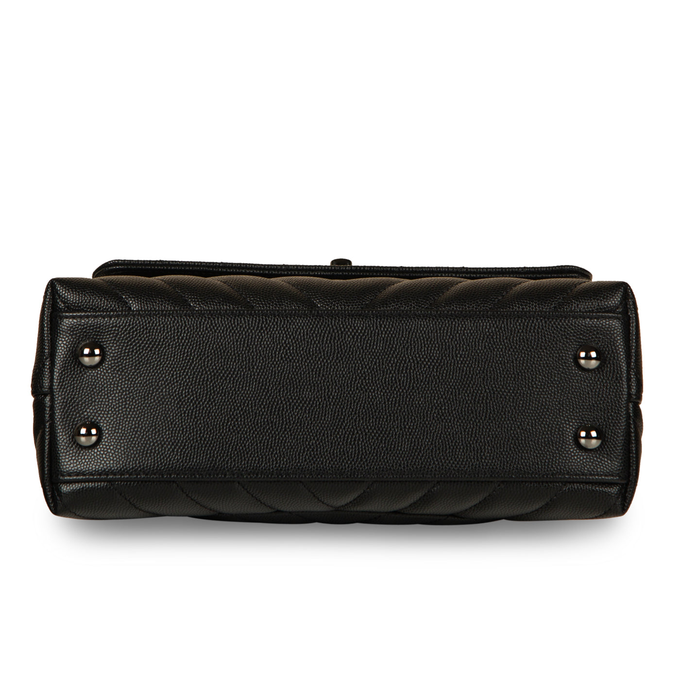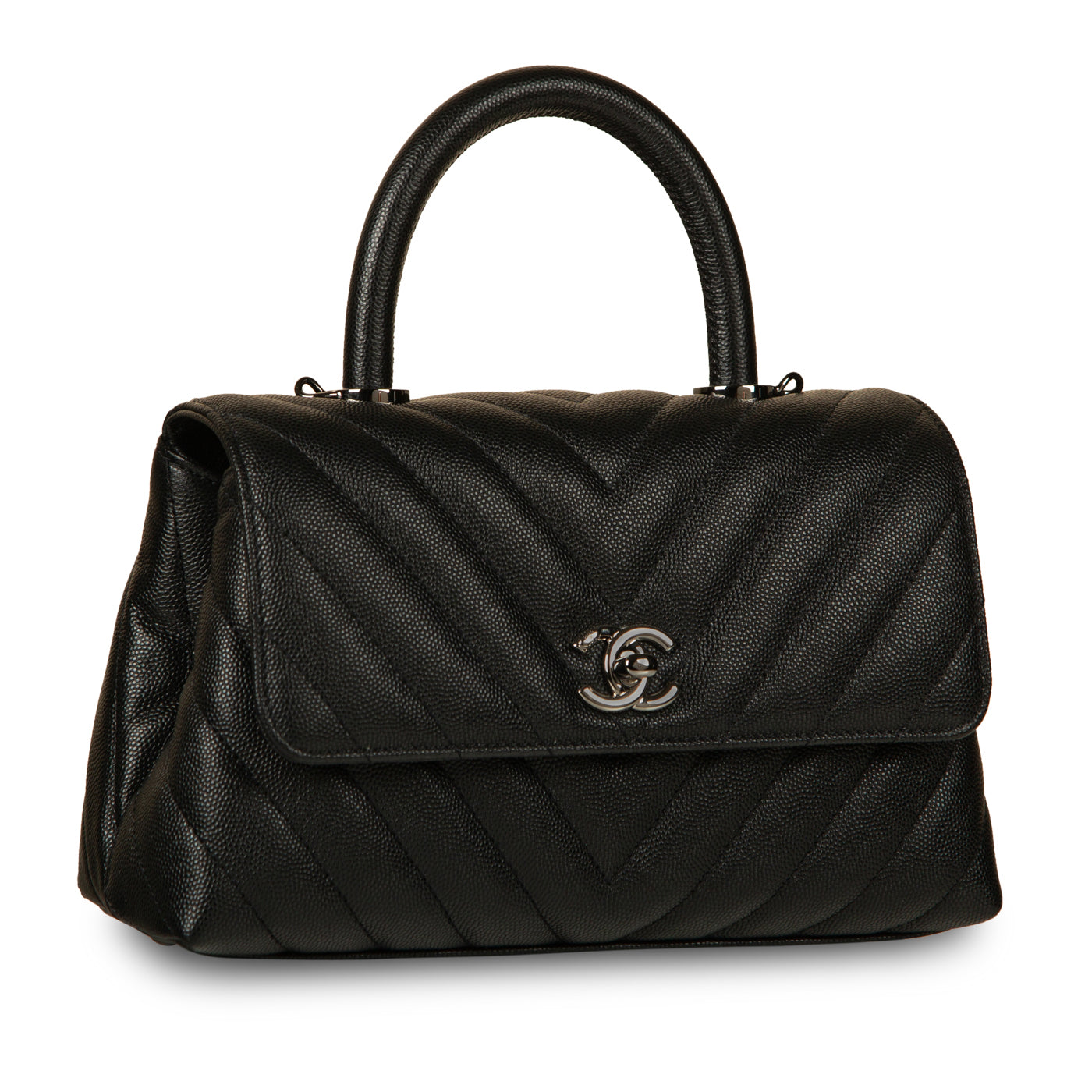 Crafted from chevron caviar leather, Chanel presents the Small Coco Top Handle bag. Featuring silver tone hardware, an interwoven chain / leather shoulder strap and a durable top handle, the Coco is the perfect balance between timeless elegance and modern edginess. Sophisticated and feminine yet perfectly in tune with modern fashion, this gorgeous bag is the ideal piece to compliment anything in your wardrobe. No matter the occasion, the Coco Top Handle can easily hold all your essentials from day to night while keeping you sleek and stylish. An investment piece you won't regret purchasing, this exquisite handbag is a true must-have for any woman with a love for luxury and a soft spot for Chanel.