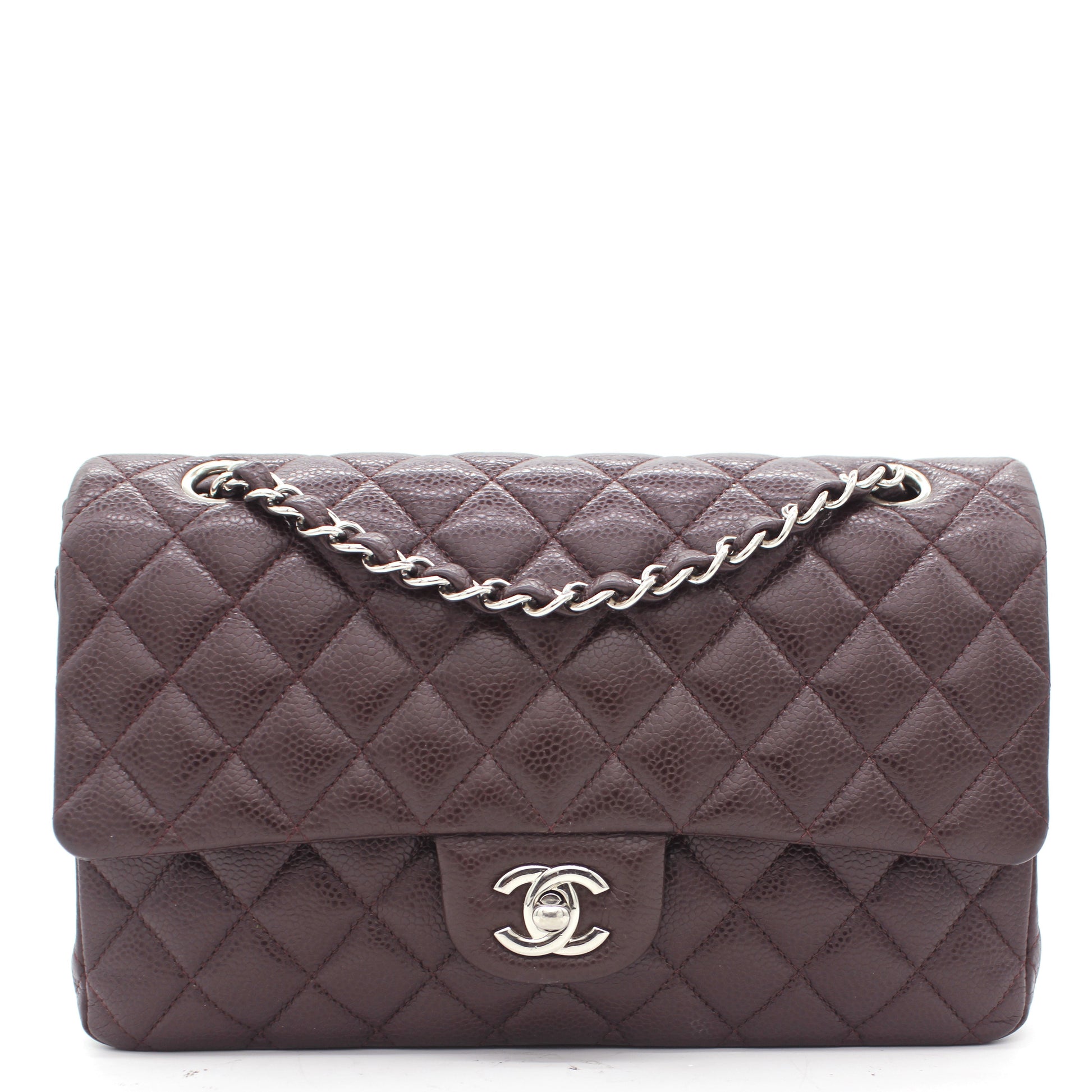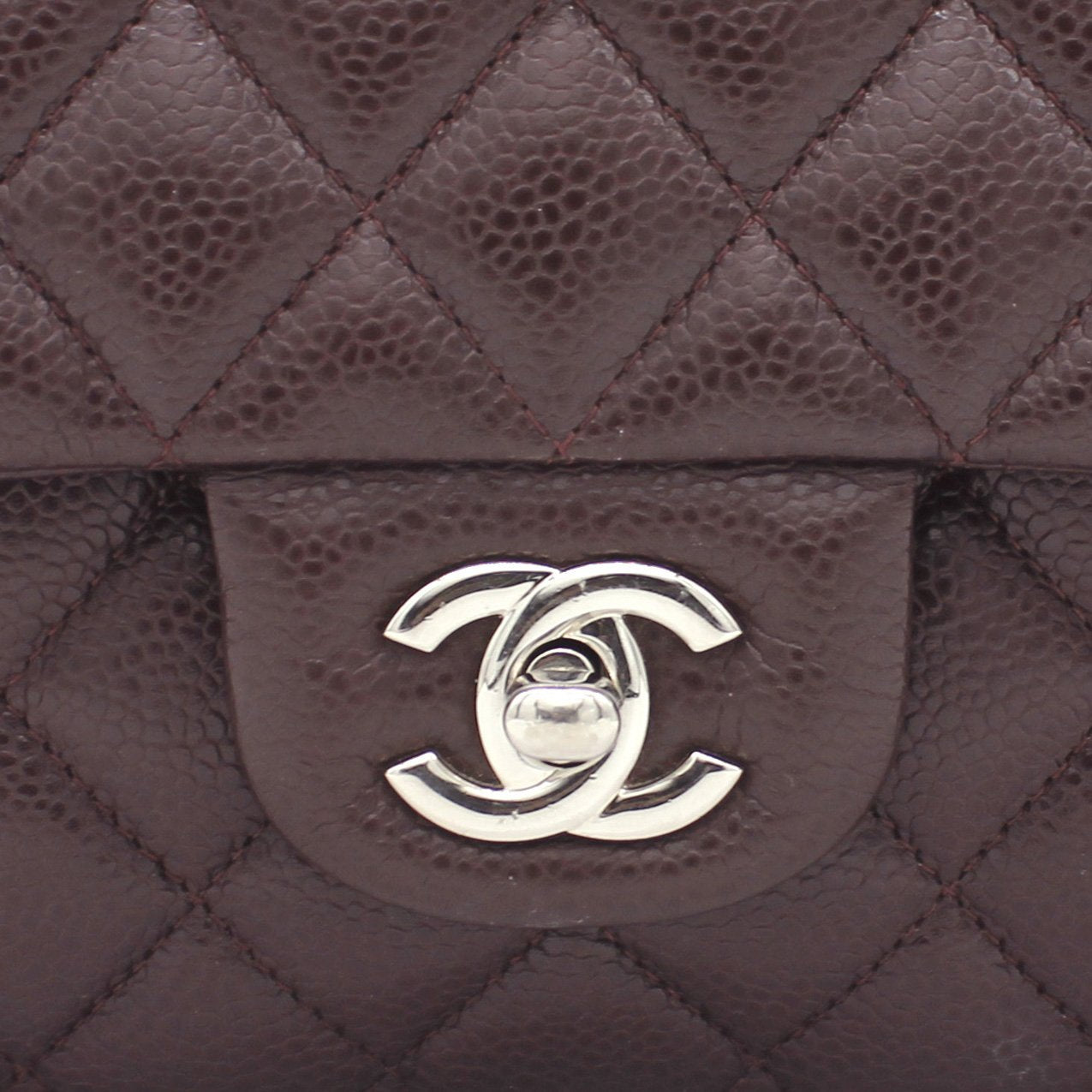 | Made in Italy, this medium double flap chain shoulder bag was fashioned from burgundy caviar leather, finished with a diamond quilt. It features a leather shoulder strap, adorned with a silver-tone chain, and a main foldover top that is closed by a CC turnlock. As it opens, it leads to a second, smaller flap, fastened by a snap button. It presents us to a luxurious bordeaux red interior, embellished with a stitched logo and a classic logo stamp. The compartment has two slip pockets and an internal logo stamp. Functional, the accessory displays a front slip pocket, hidden under the double flaps, and another one open on the back. | Outer Material: Leather Lining: Suede Leather Hardware: Silver-tone Accessories: Dust Bag; Serial Number: 20003714 Bought Year: 2015 | ![]() |