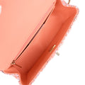 The interior is lined in coral leather and features a zipper pocket with chanel pull and an open pocket below.
