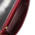 The interior is lined in burgundy leather and includes one zip pocket and one slip pocket on the back wall.