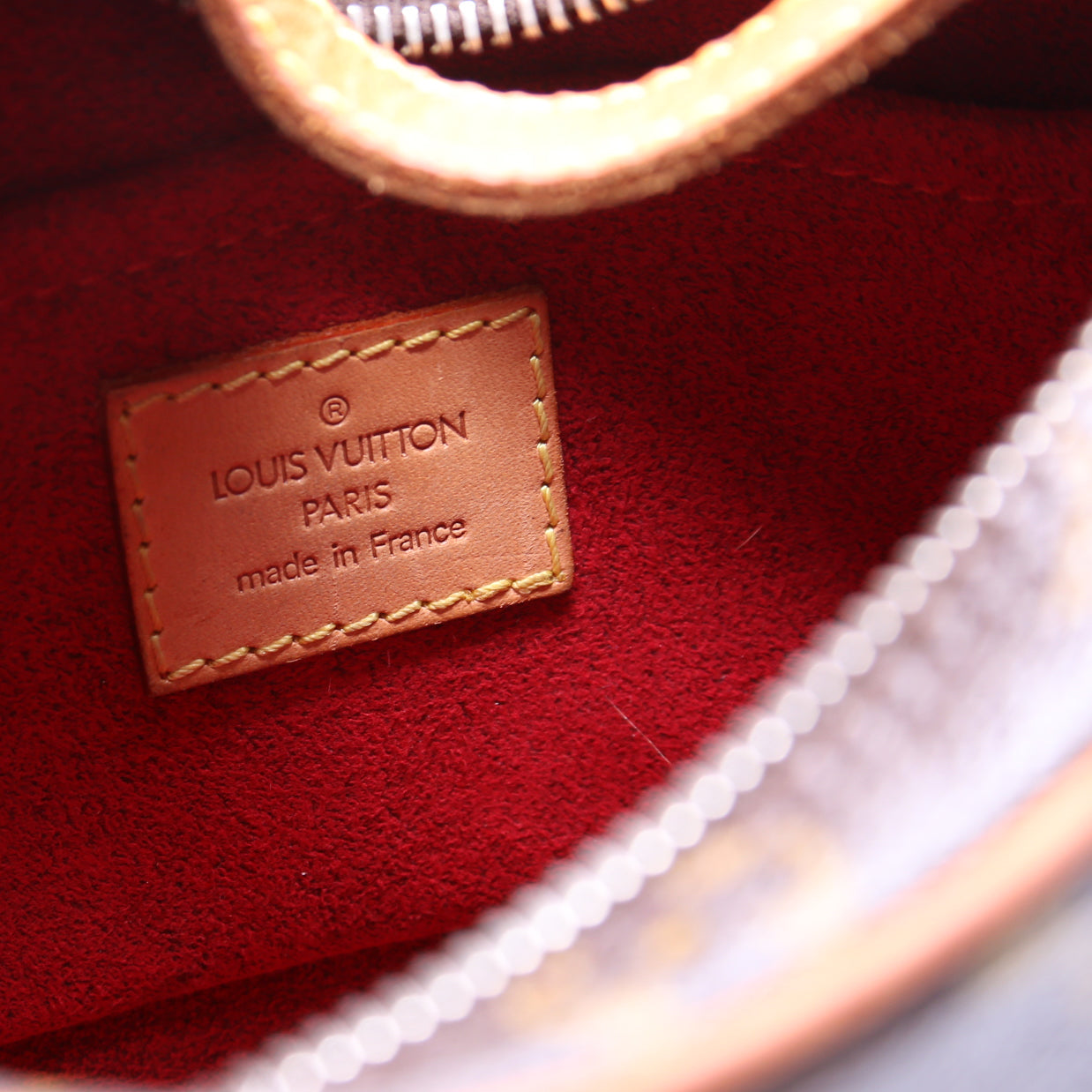 Exterior: The exterior Monogram coated canvas is free of any rips or cracks. The leather piping shows wear and discoloration.