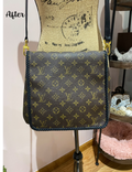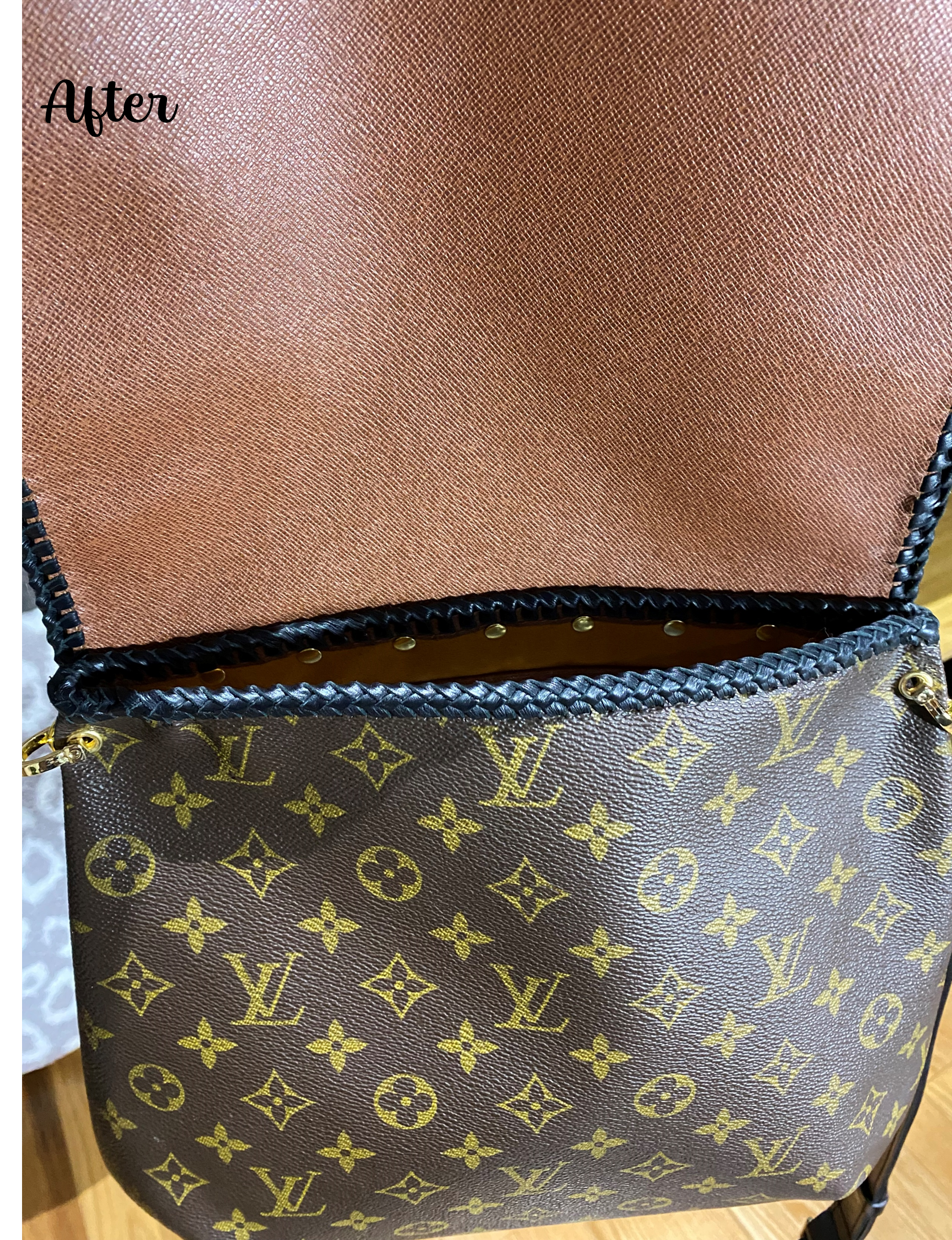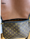 This bag came to me with a large tear in the back. I had to remoe the flap, cut the bag down, and then reattach the flap. The customer also wanted the braided trim to be black, so I dyed the vachetta trim and her strap to match. Look how beautiful she is now!!